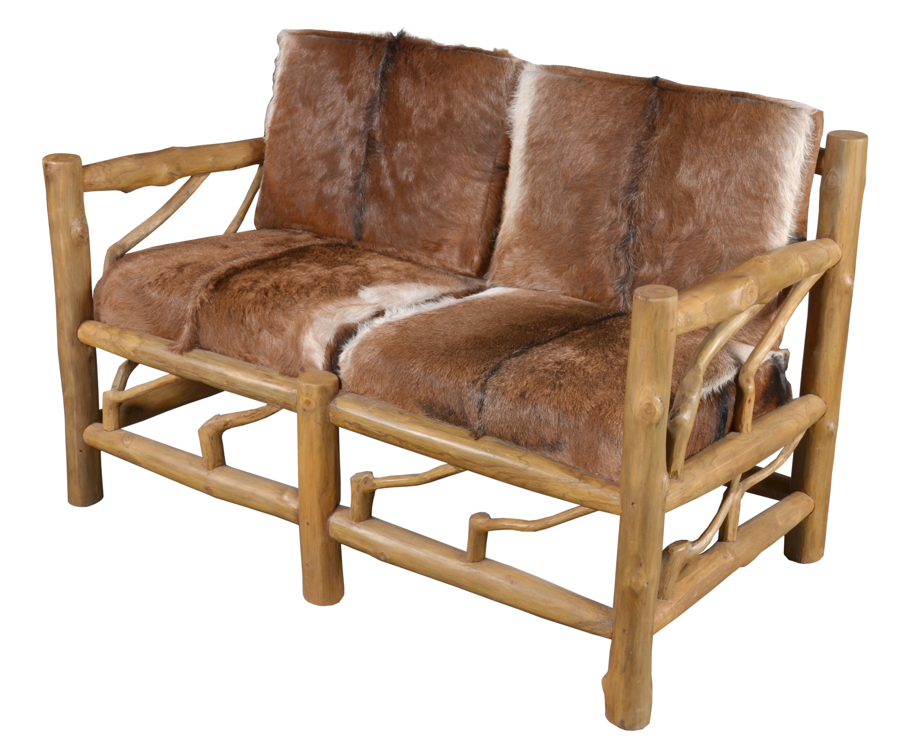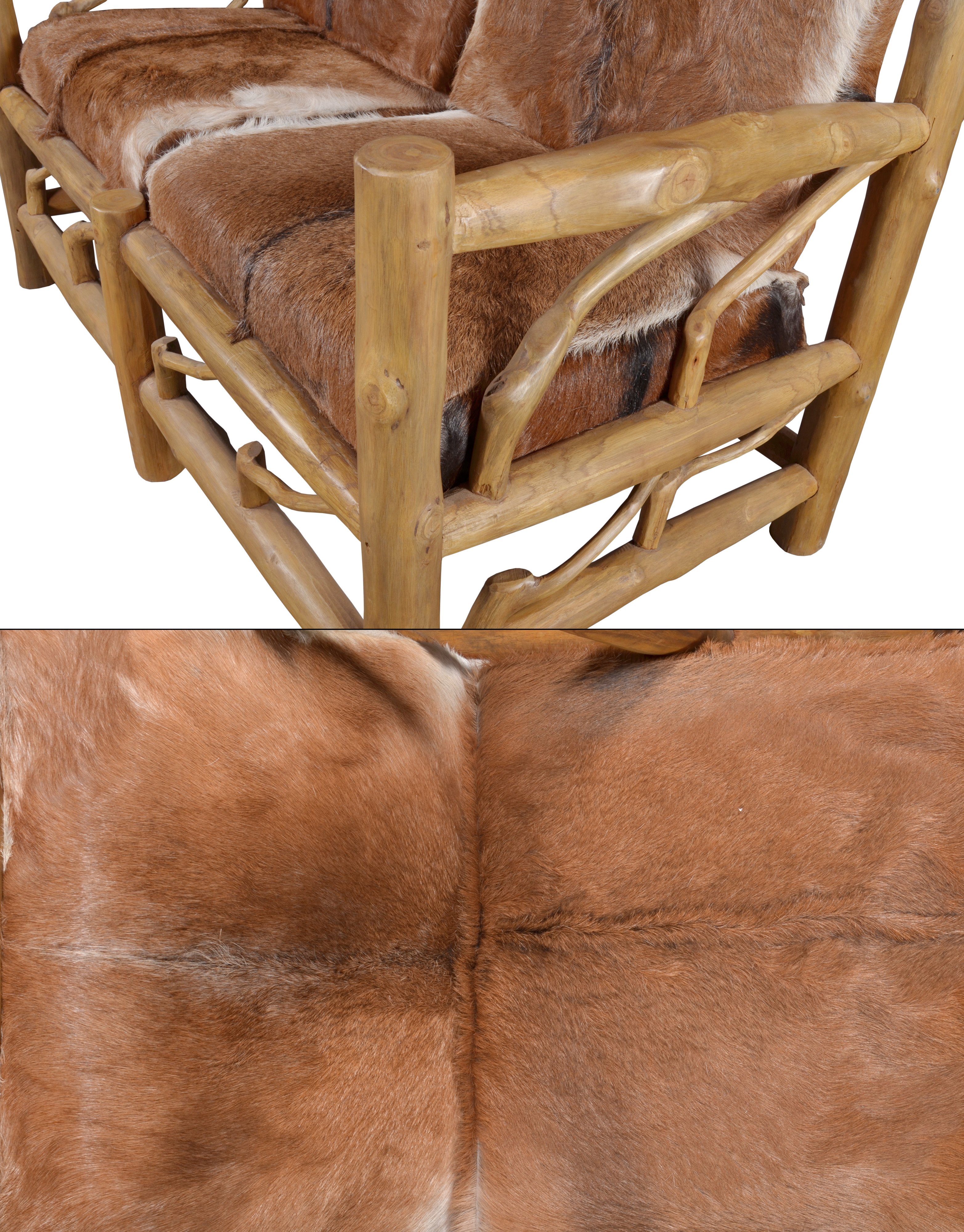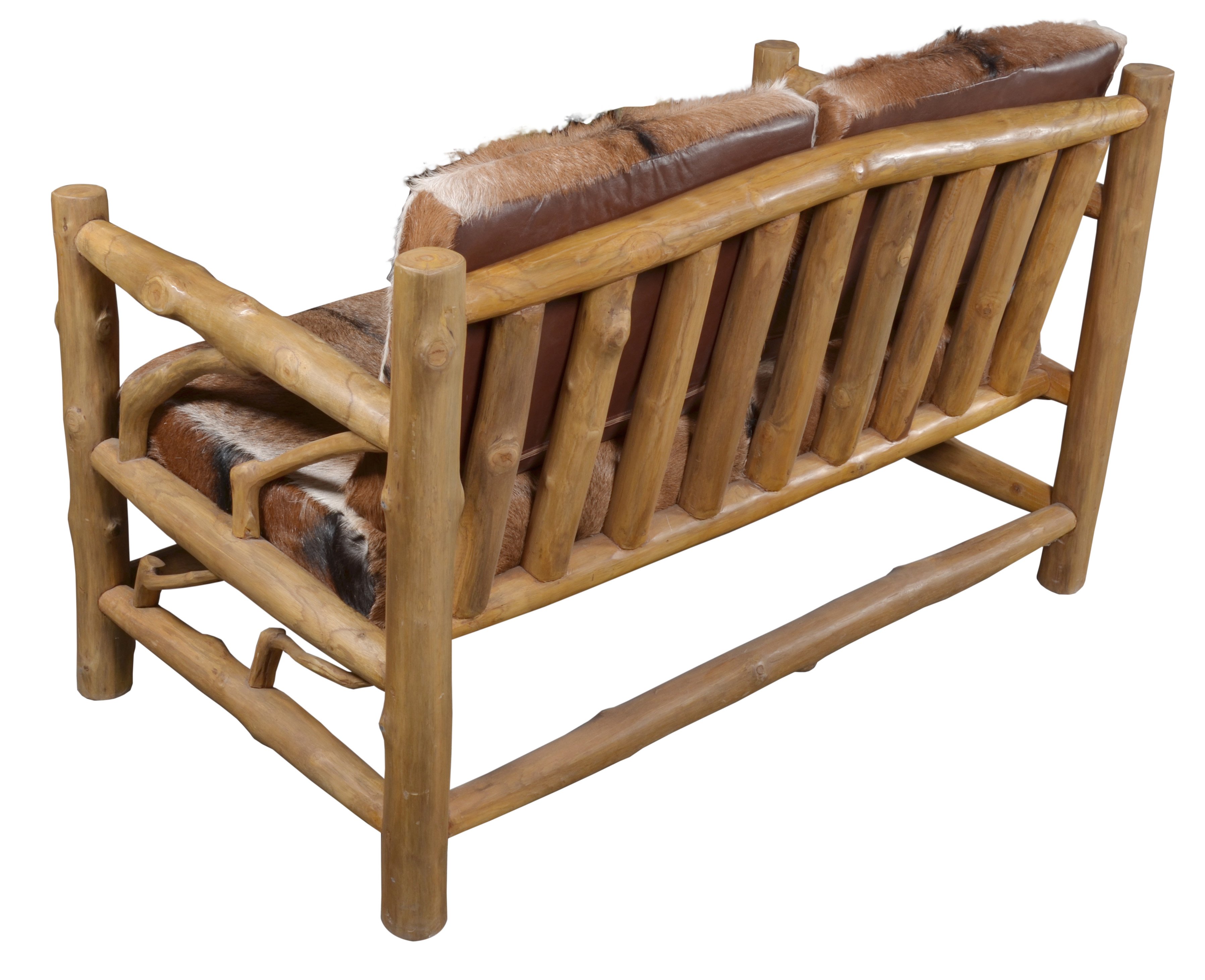 A 50 " wide x 31" deep x 33" tall comes this Fur Teak Lodge Settee, a two seat sofa from our Adirondack Teak Collection. Adirondack furniture refers to a rugged architectural style using native building materials within an irregular wooded landscape. The settee offered is made using natural exotic Teak lumber from Indonesia. it is hand crafted using age old and proven mortise and Tenon construction. This technique has been used for thousands of years by woodworkers around the world to join pieces of wood, it is the most authentic looking construction and very strong. The seat cushions and backs are beautiful and covered in authentic hides. This item is sold separately but often combined with other offering from the Adirondack series for a more complete designed affect. Made by hand and imported from Indonesia.