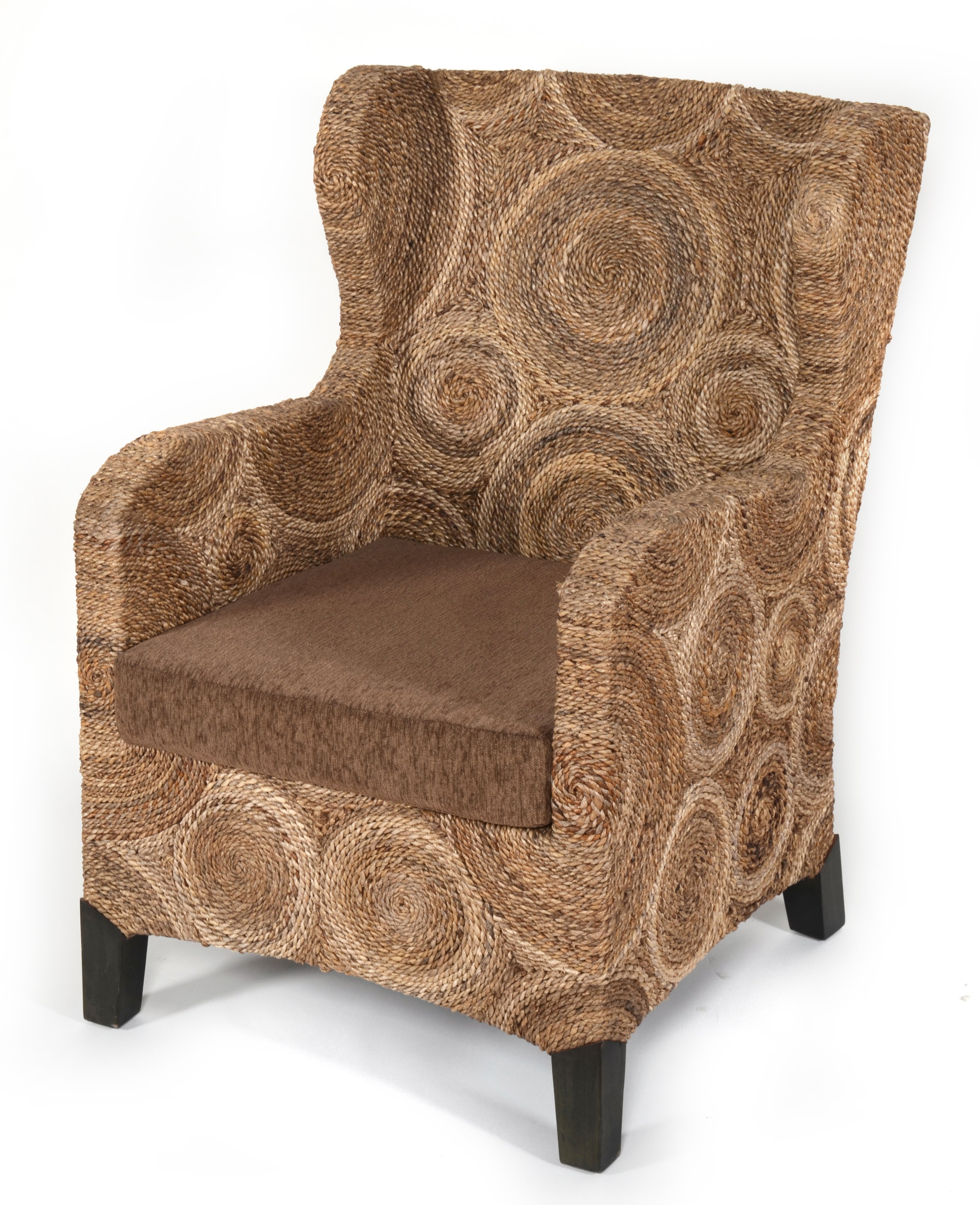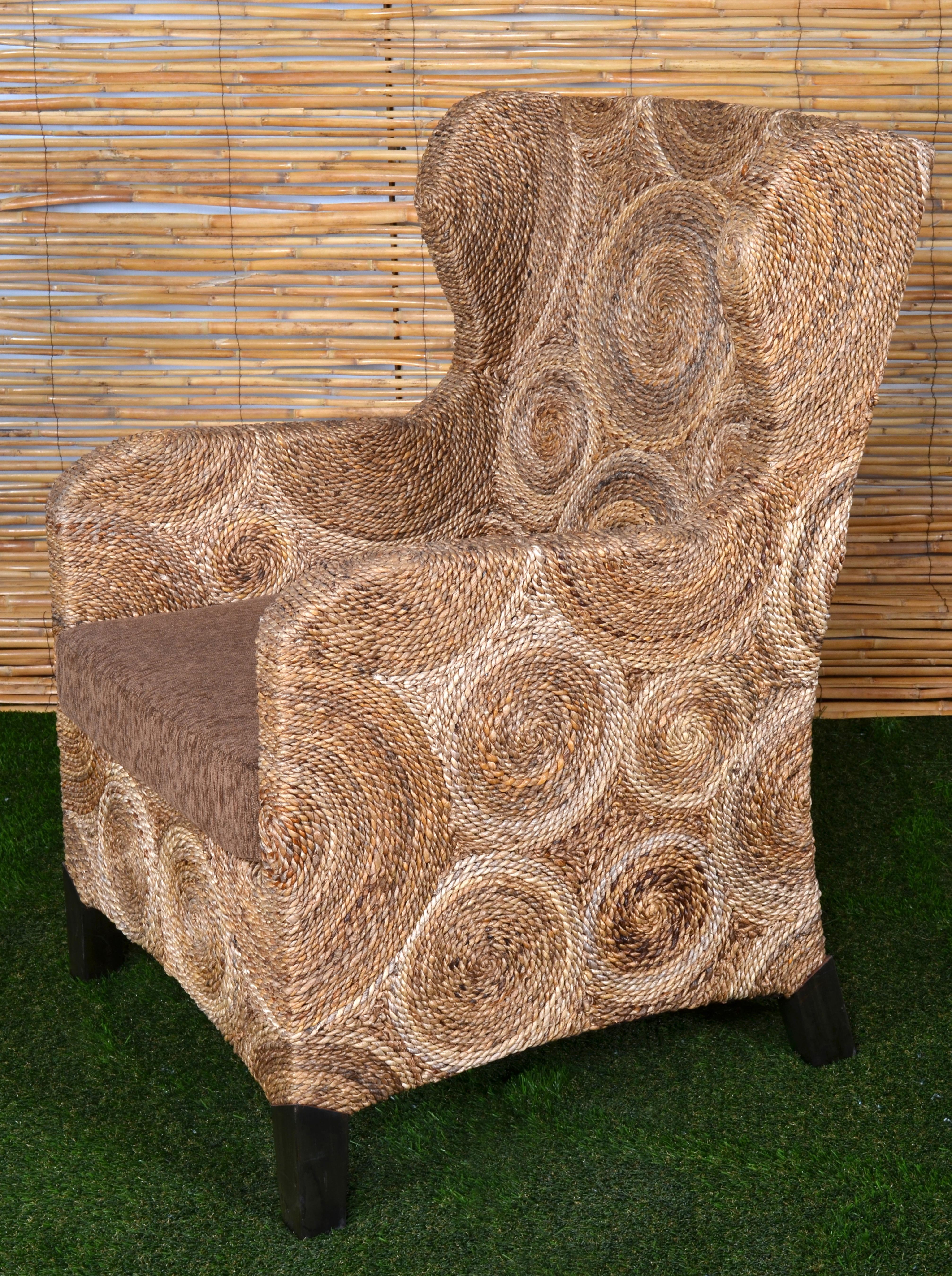This modern organic Chair offers a contemporary twist when adding organic elements in design. Special attention was paid to making this Chair taller and comfortable. Measuring 29.00 x 33.00 x 42.00 Inches. Sold Separately, This chair is often ordered in pairs for seating balance. Hand Made over solid mahogany framed. Hand Woven by selected weavers capable of executing the design are using the strongest Water Hyacinth Natural Weave. Beautiful natural finish contrasts slightly for affect with the darker brown Chenille fabric used. This chair and design is only for covered spaces and not suitable for exposure to outdoor weather for long periods of time. Minor Assembly of legs may be required. Imported from Indonesia and exclusively manufactured for the AFD Home Collection.