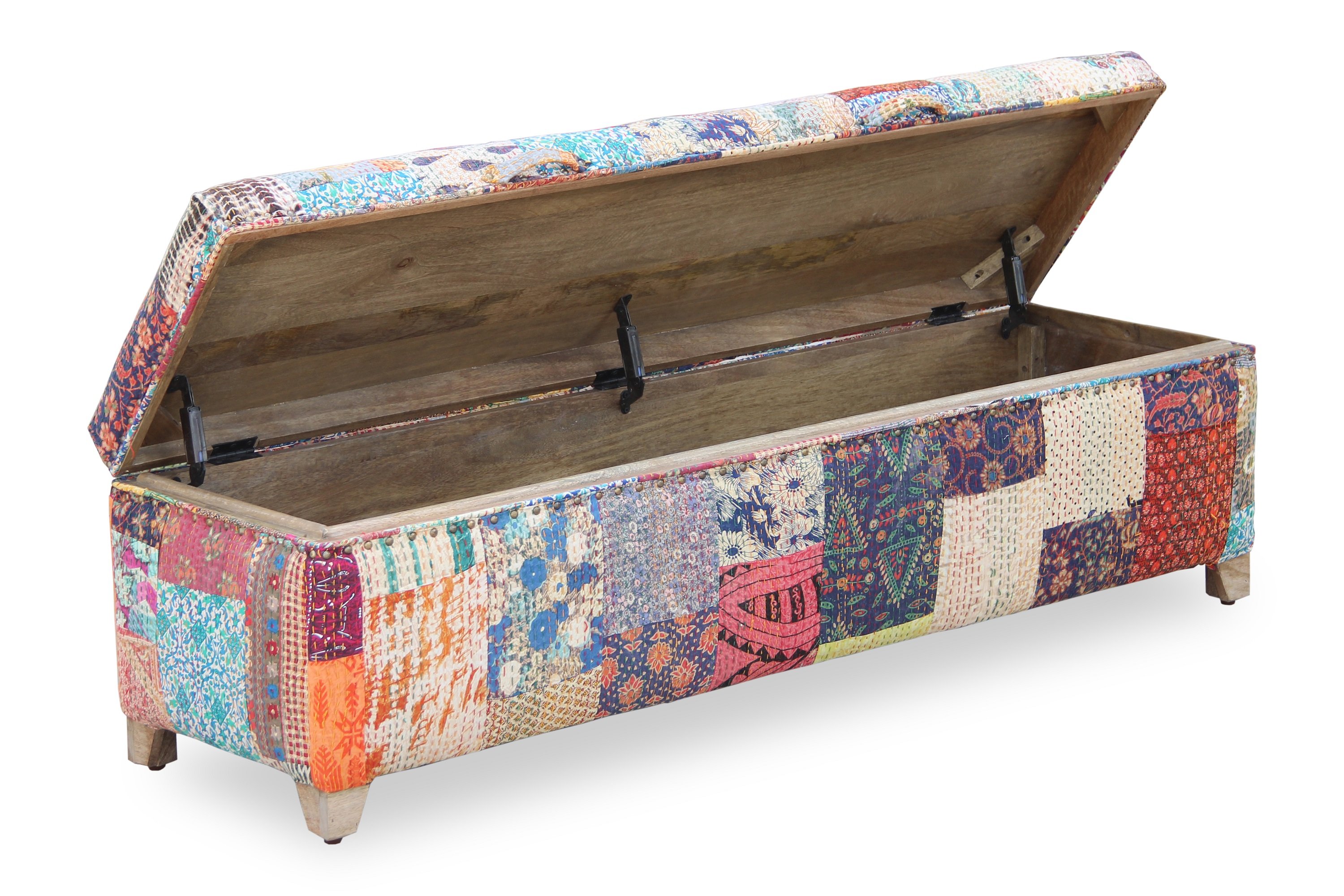 The Cadence Patchwork Bench Ottoman with Storage 60 Inch is a particularly popular and functional Ottoman/ Bench. This ottoman is constructed, using tongue and groove joint methods, of mango timber-with exposed wood in a water resistant lacquer sealed blended finish. The interior is fully framed in Mango and offers a clean and very well made storage feature. The fabric used for the upholstery is a varying combination of patchwork fabric quilts, hand cut and sewn by local cooperatives who add decorative stitching. The decorative nail heads are individually set. No Assembly Required! Hand Made in India.