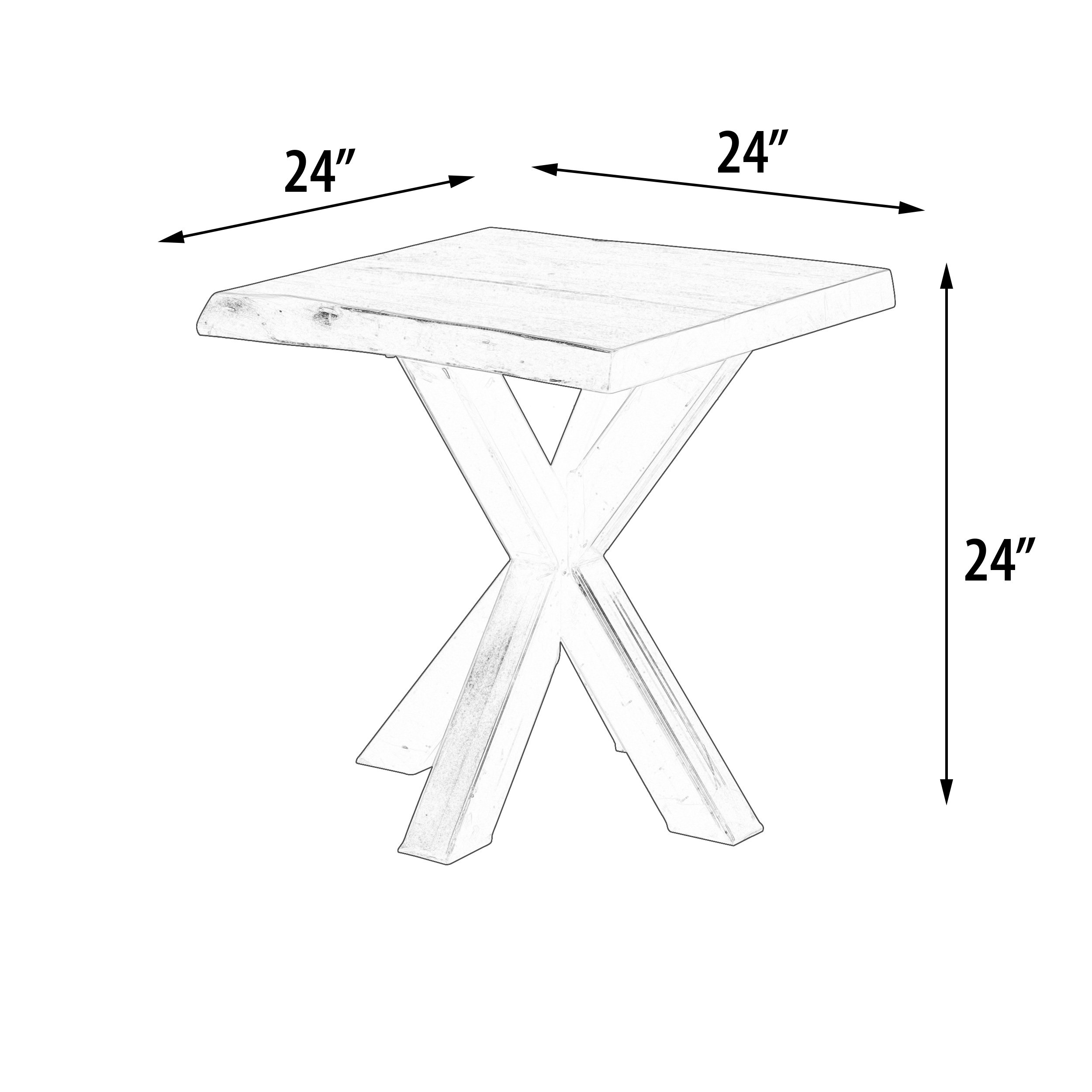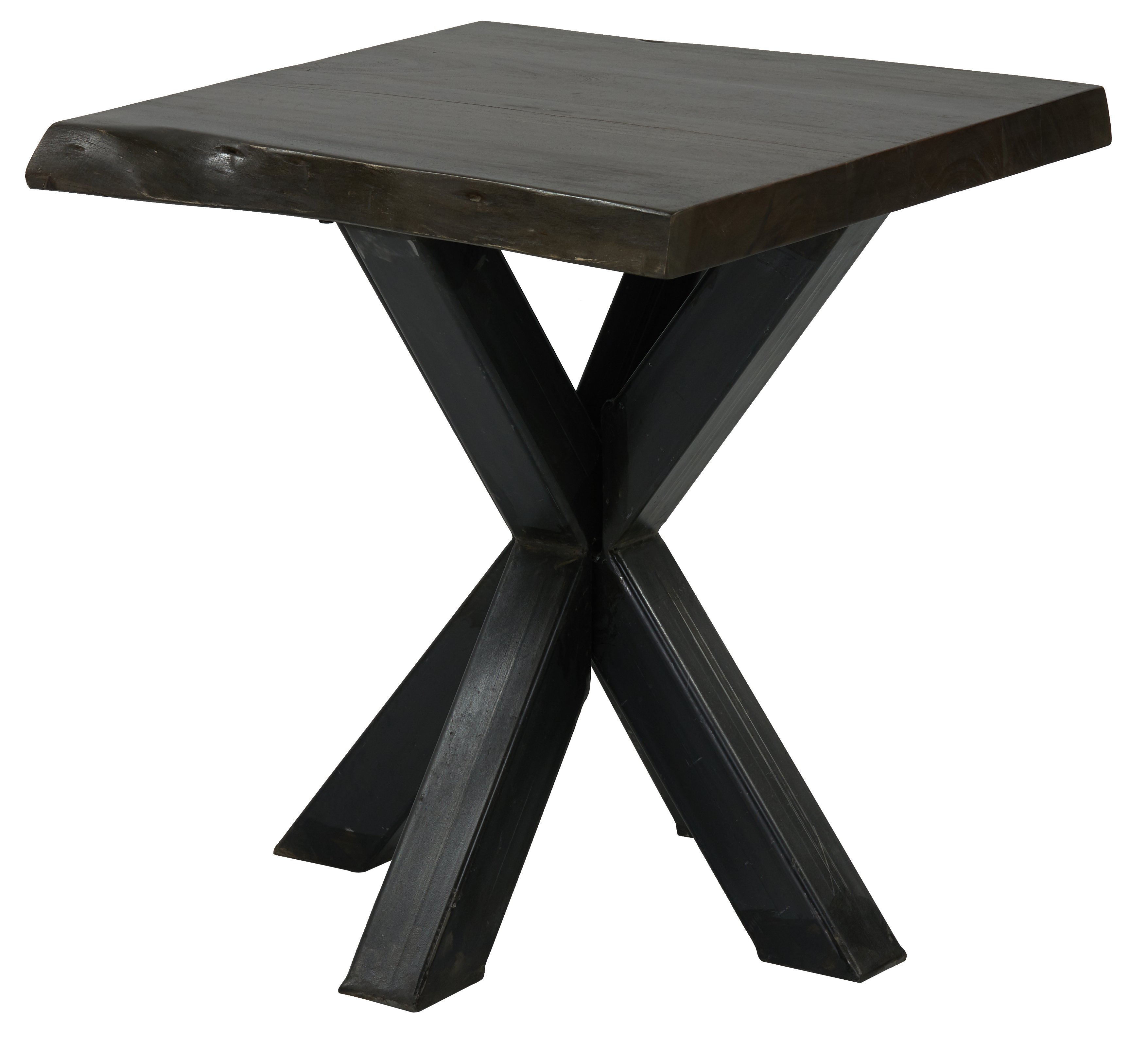 Mountain Studio Natural Live Edge Wood and Steel Side Table 24 Inch. Beautiful thick slabs of Natural Live Edge Mango Hardwoods are hand selected and mounted on heavy Steel Industrial Cross Designed Legs. A graphite wood stain offering a rich depth of tone is used to protect and enhance the wood. The hand finishing of the wood and the Steel legs offer an overall balanced finish affect. The Mountain Studio Collection offers furniture designed for a Rustic Modern lifestyle. Crafted in strength a furniture quality you can count on, that will last and offer years of low maintenance real family use. The Side Table offered pairs perfectly with the matching Mountain Studio Natural Live Edge Wood and Steel Coffee Table 54 Inch or the Mountain Studio Natural Live Edge Wood and Steel Console Table 58 Inch to complete your Collection. Hand Made in India for AFD Home. Minor Assembly Required