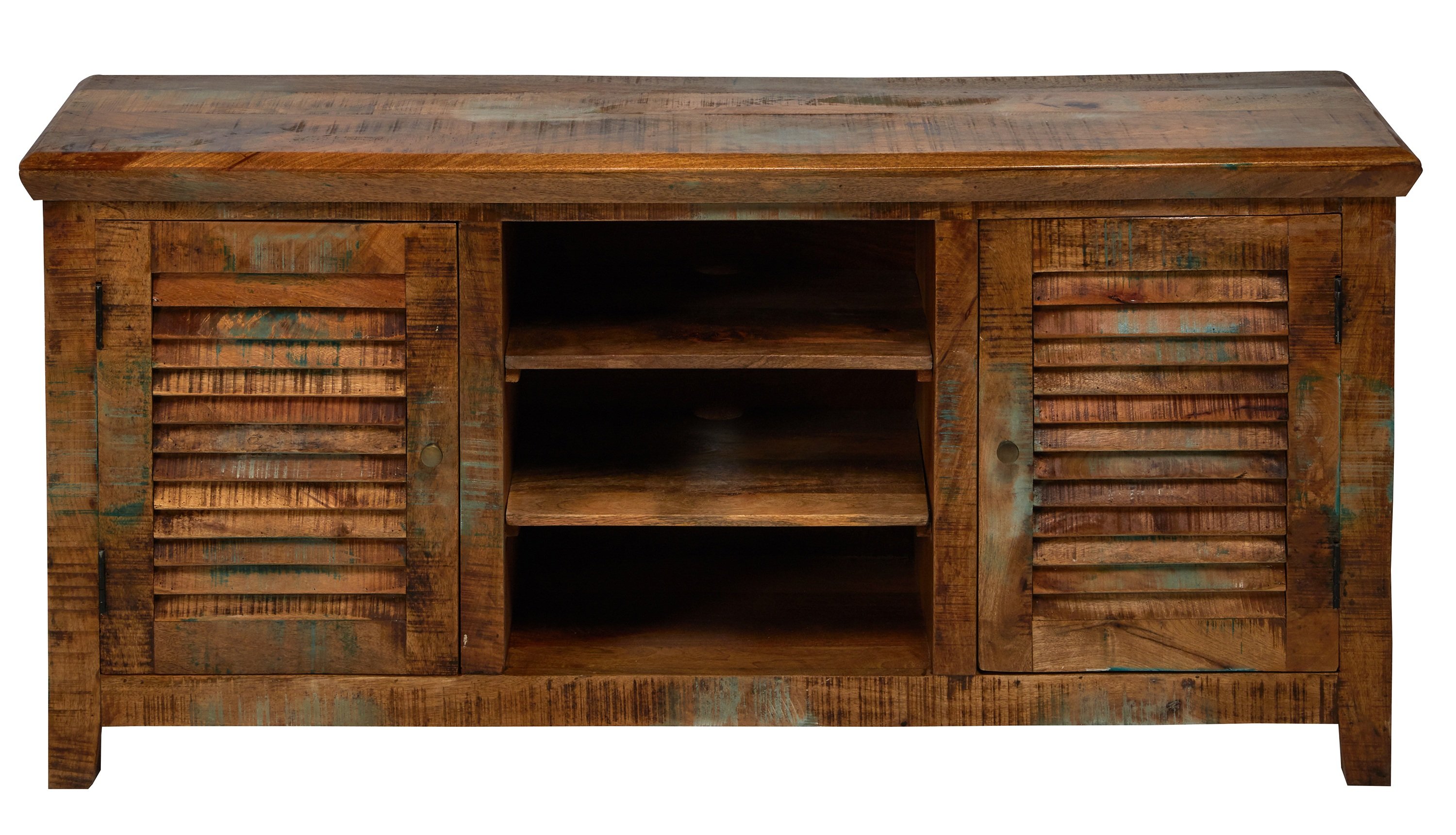 Mountain Studio Design presents their beautiful solid wood Rustic Entertainment TV Console Unit is 64 Inches Wide by 30 Inches Tall. This Entertainment TV Console is constructed, using a combination of Old and New reclaimed timber of mango hard wood. The finish is an authentic aged and weathered affect done by the skilled artists at Mountain Studio. Additional Features include louver style shutter slat doors, removable center shelves for concealed storage and antique brass finished knobs. Consider combining this with other Rustic, farmhouse, lodge and Cabin designs from Upholstery to Complete Rooms and lots of functional Items. Hand Made in India for AFD Home. No Assembly Required!