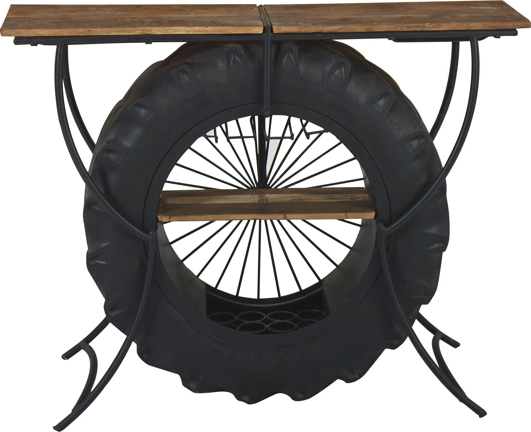 Mountain Blacksmith Authentic Truck Tire Console Bar Counter Vintage 64 Inches. Another Unique Find! An Authentic Truck Tire that has been re-purposed and designed into a Wine Bar and Counter, mounted on an Iron stand for secure placement. This design works well for any Mechanic, Auto or racing Enthusiast or the missing piece to create the coolest Man Cave. The Mountain Blacksmith Collection is styled to be special in any Interior. Authentically Hand Created by our skilled Blacksmiths using Old re-purposed Motorcycles. These bikes have lots of History and Stories to Tell after being salvaged by our Pickers from the busy day to day traffic, that they each were a part of, from the busy streets of Rajasthan India. Original and Imported from India. Like these unique type hand made items from the Mountain Blacksmith Collection of AFD Home then check out all the cool options for your fun room or business. No Assembly Required, Enjoy!