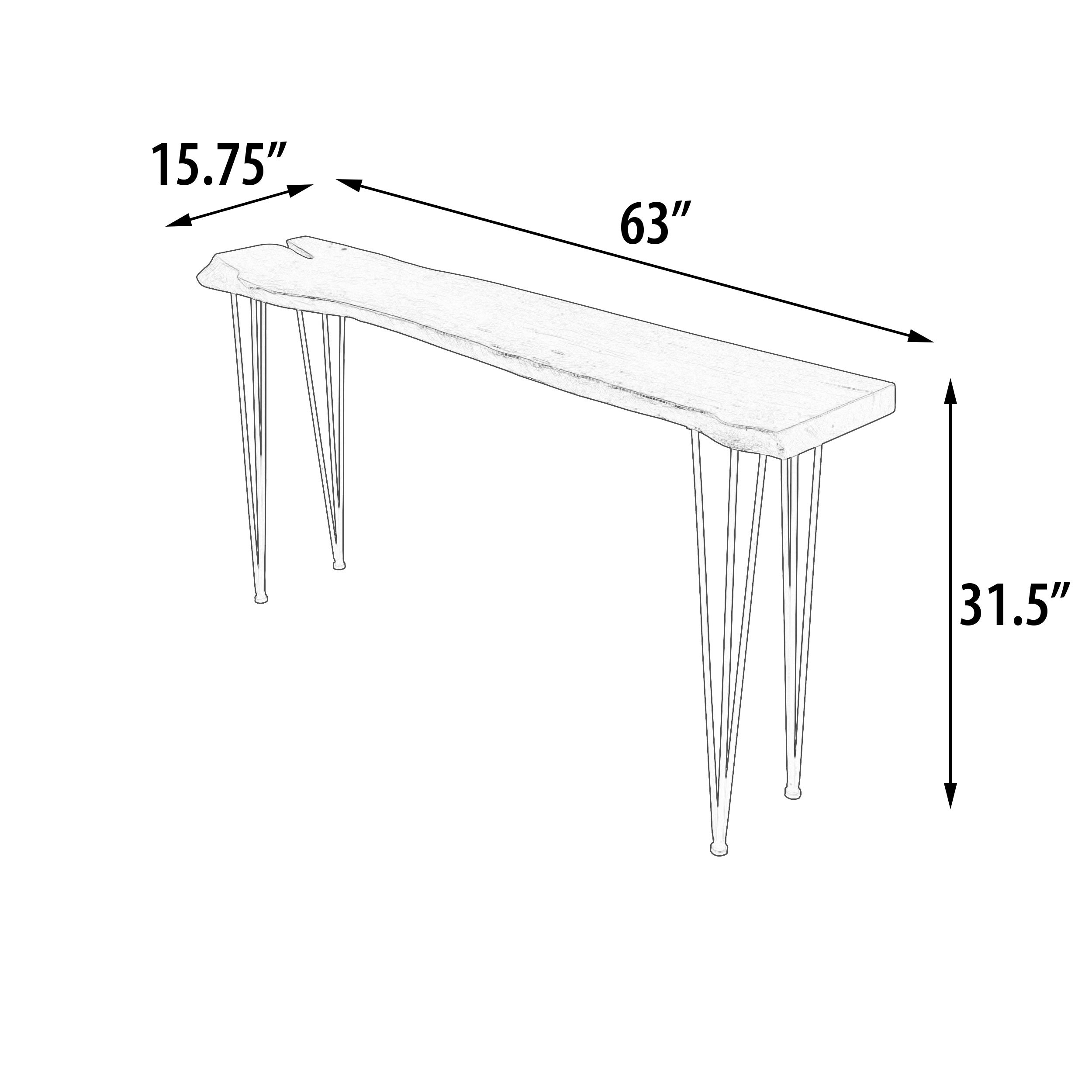 Another modern rustic design from Mountain Studios. Offering a Mango Wash Live Edge Console 63 Inches Long with decorative Iron Legs. Utilizing the abundant hard woods of the forests of Indonesia specimens of Live Edge Mango, are collected and used for this console. The black cast iron legs enhance the cleaner style and offer a more current looking support legs. The Mango top with live edge is mounted and then finished in a softer white wash finish. Minor assembly of legs to base required. Imported from Indonesia.