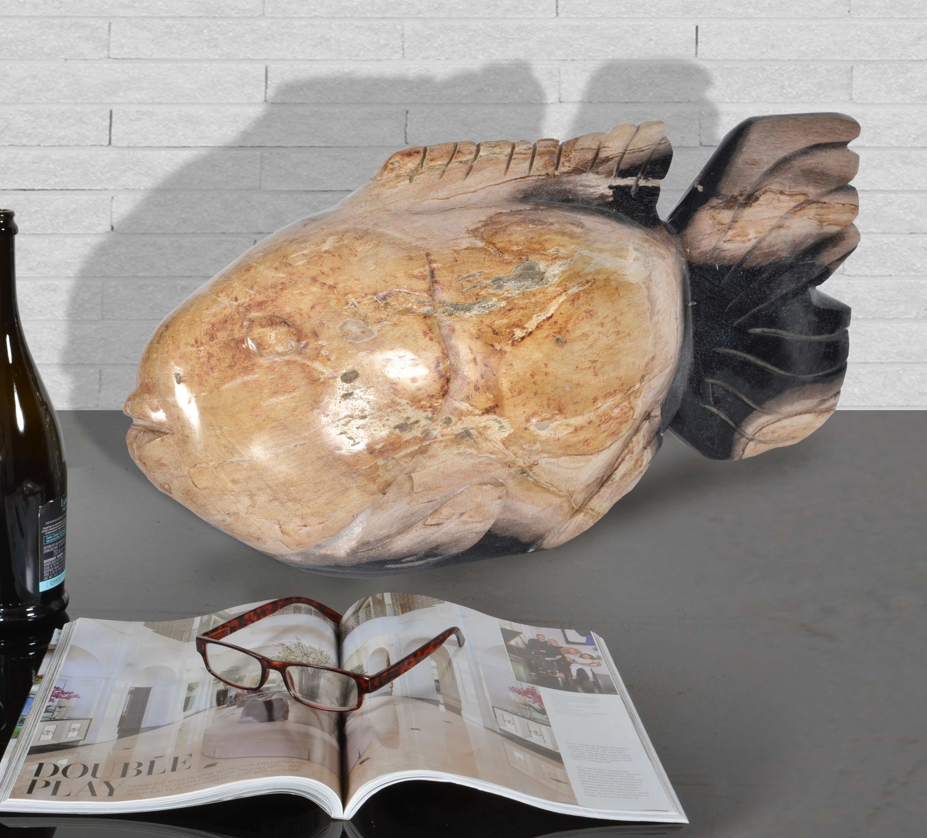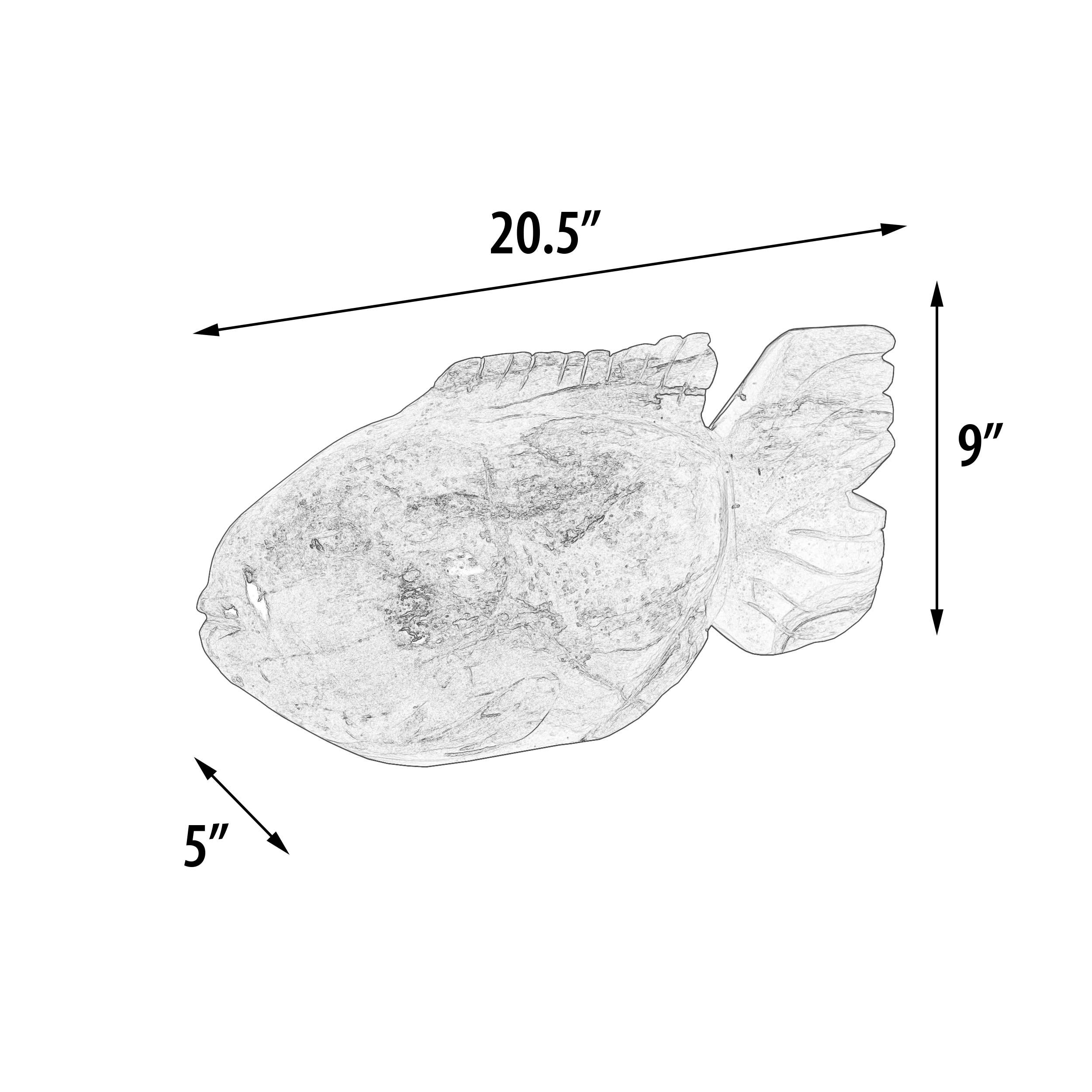 A Rare Authentic Find! From the Mountain Studio Design Collection comes this Petrified Wood Fish 21 Inch Authentic Specimen, Fossil, Stone Artist Sculpture. Petrified wood specimens are wood that has been fossilized into a stone over Millenniums. Understanding Petrified Wood 1) Specimens age ranges from a young 50, 000 to over million year old 2) Our specimens are found underground in the remote forests of Indonesia 3) When wood is covered by soil over the Millenniums the covered wood becomes deprived of oxygen and all rotting and deteriorating stops, slowly the wood pores absorb the minerals from water and massive fallen trunks are shrunken to perfect specimens for use in jewelry and Arts. 4) The petrification process creates a beautiful permanent snap shot of the wood for eternity. The local craftspeople seek these valuable rarities and create their Art for us. Hand Carved and Created in Indonesia for AFD Home. No Assembly required.