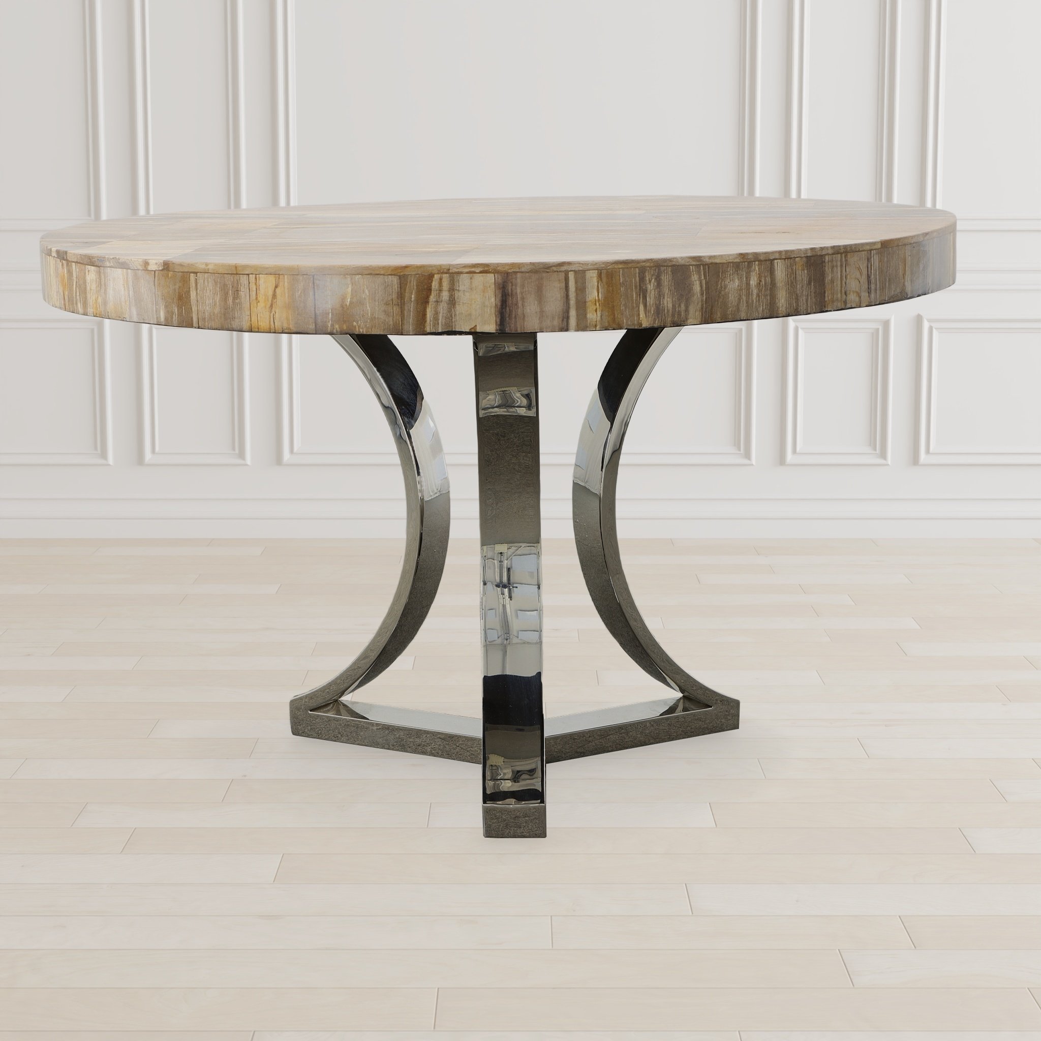 A very special exclusive Find! Presenting from the Mountain Studio Design Collection this Spectacular 60 Inch Round Center, Dining Table, Authentic Specimen, Fossil, Stone. Petrified wood specimens are wood that has been fossilized into a stone over Millenniums. The local craftspeople seek these valuable Petrified Wood Specimens to create this Authentic Petrified wood Table Art for us, in sizes that make these precious Fossil Table functional for Todays finest Interiors. Whether a striking center table for an entry or for daily use as your dinette Table, Petrified wood table tops are very strong with their stone like characteristics. The creation of these tables starts by finding the fossil pieces which are organized then sliced to workable sizes. Artists arrange and set the specimens onto a Plywood substrate for support, creating this one of a kind authentic Petrified Wood Stone table top. The base is also original and combines the skills of Mountain Blacksmiths as they created the artistic designed Stainless Steel Base. Understanding Petrified Wood 1) Specimens age ranges from a young 50, 000 to over million year old 2) Our specimens are found underground in the remote forests of Indonesia 3) When wood is covered by soil over the Millenniums the covered wood becomes deprived of oxygen and all rotting and detreating stops, slowly the wood pores absorb the minerals from water and massive fallen trunks are shrunken to perfect specimens for use in jewelry and Arts. 4) The petrification process creates a beautiful permanent snap shot of the wood for eternity. Hand Created in Indonesia for AFD Home. This special table is offered in 3 popular sizes, 48, 60 round and 96 Inch rectangular. Minor assembly of top to base required.