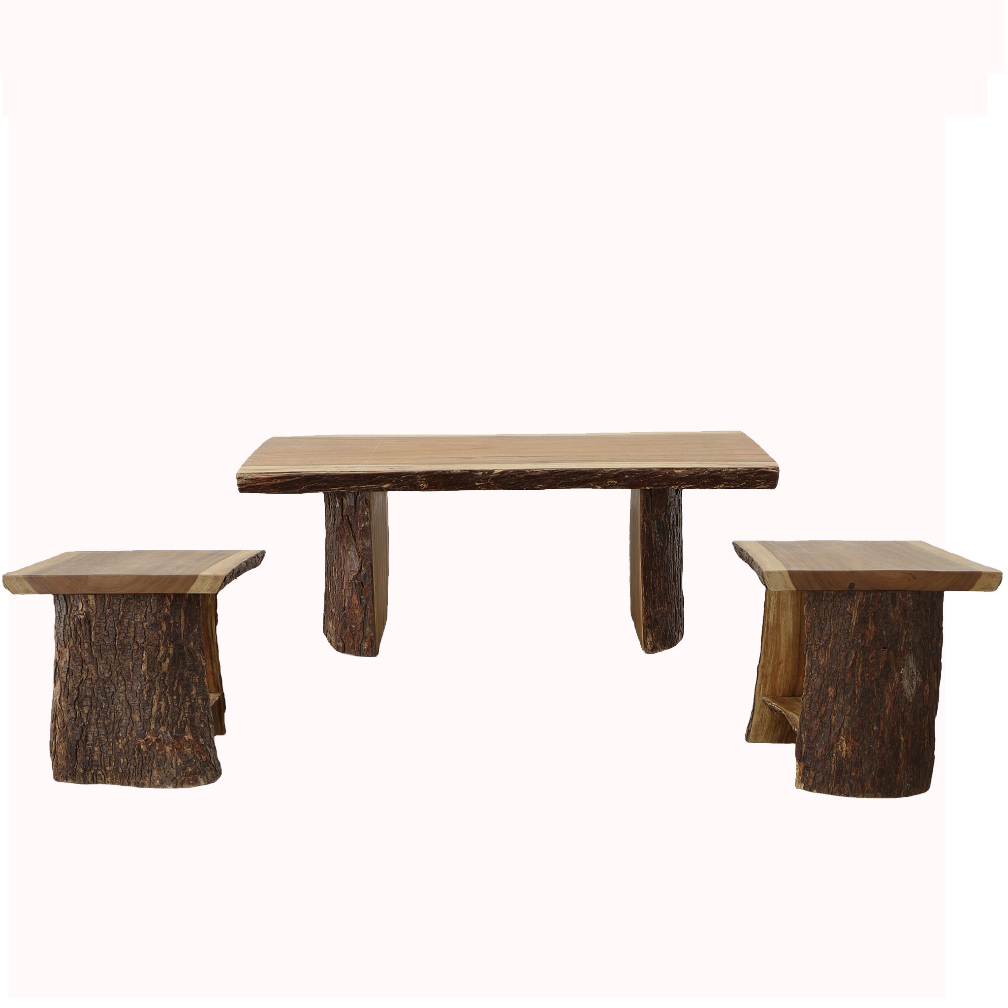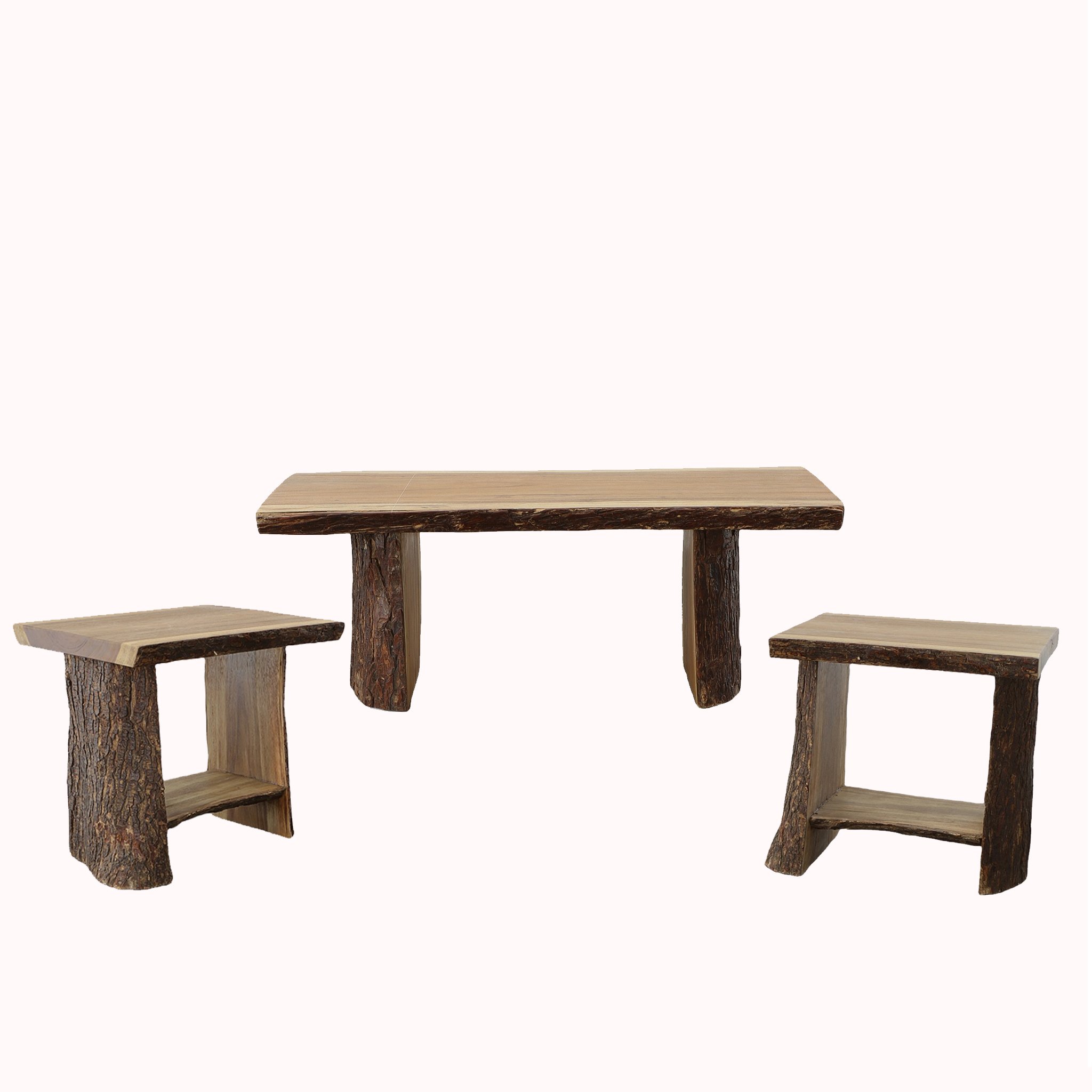 One of the newest additions to the Authentic Timberline Solid Natural Wood Collection is the complete cocktail or Coffee Table Set of 3. The purity of the rustic design is a great find for your special retreat! Set of 3 Includes 1 x Timberline Natural Coffee, cocktail Table 47.75 Inch and 2 x Timberline Natural Side Table 24 Inch Beautiful Suar specimens of wood with live edges and with original bark are collected and maintained though production, creating a very natural Rustic Furniture. Suar wood is used for this collection by Mountain Studio Designs, it is often referred to as Oriental Walnut for its contrast between the darker heart of the center wood and lighter outer bands is a plentiful species. Also referred to as Monkey trees these big creations of nature grow tall and have large canopies that the local inhabitants love to hang around under. Consider completing your set with either the Entry or Entertainment Console from Mountain Studios Timberline Collection offered, to help expand this natural collection for our purest customers looking for the best in natural decor! Hand Made and Imported from Indonesia!