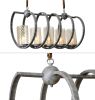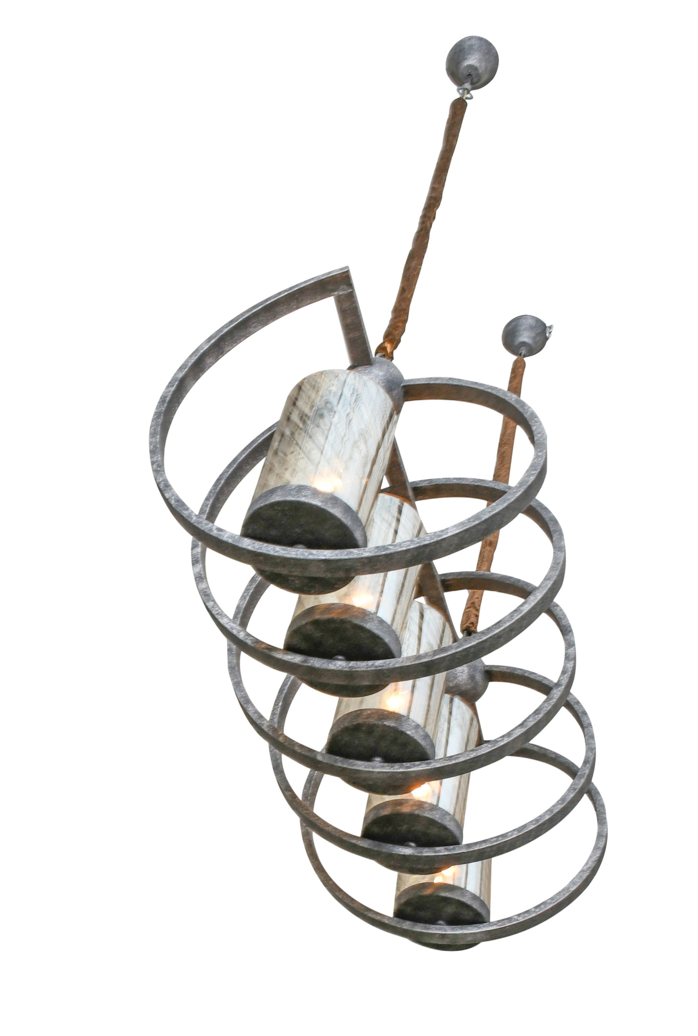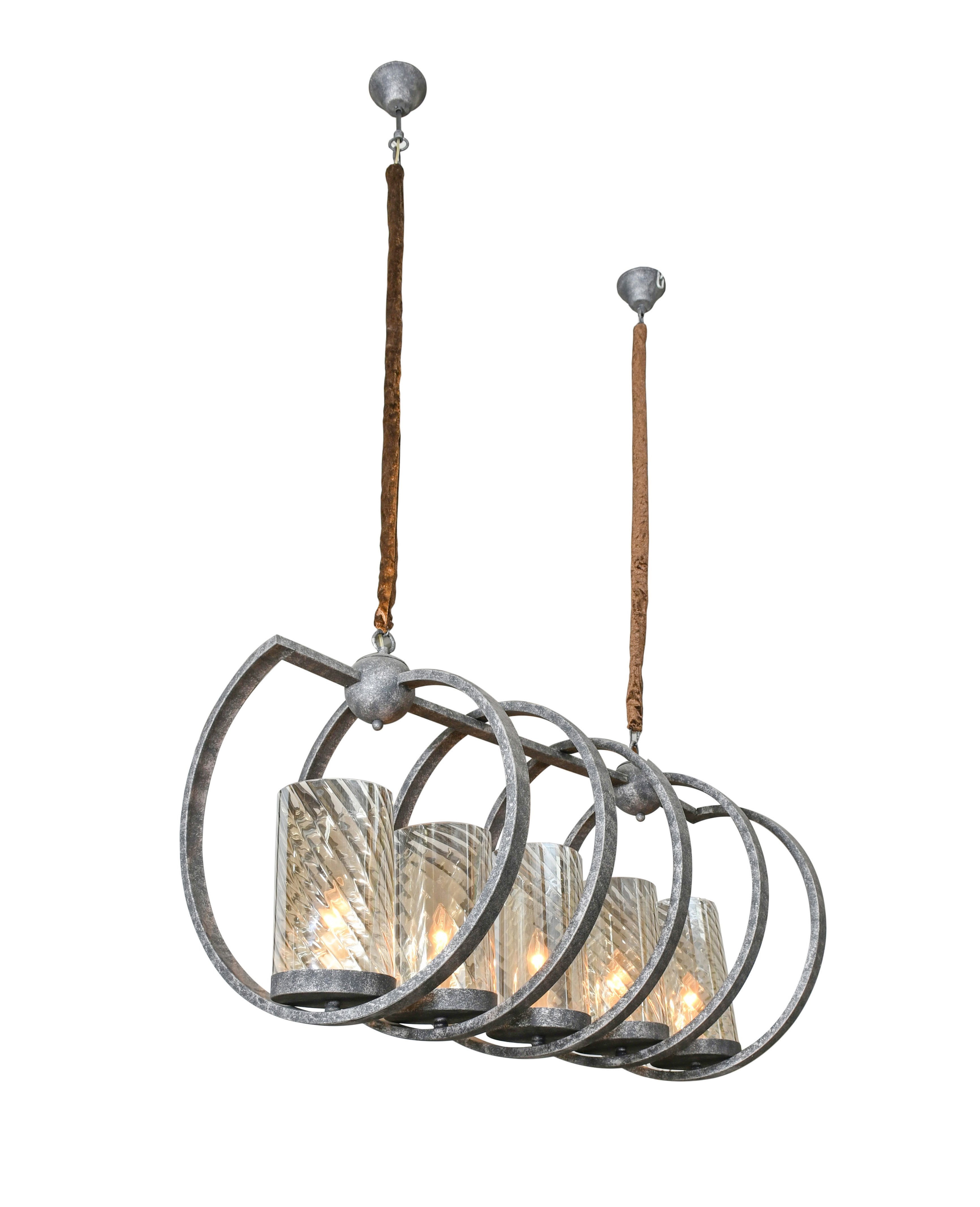 A dramatic circular iron and blow glass chandelier. It has a rustic charm but with modern flair this chandelier has 5 ligths and is made of high quality materials.