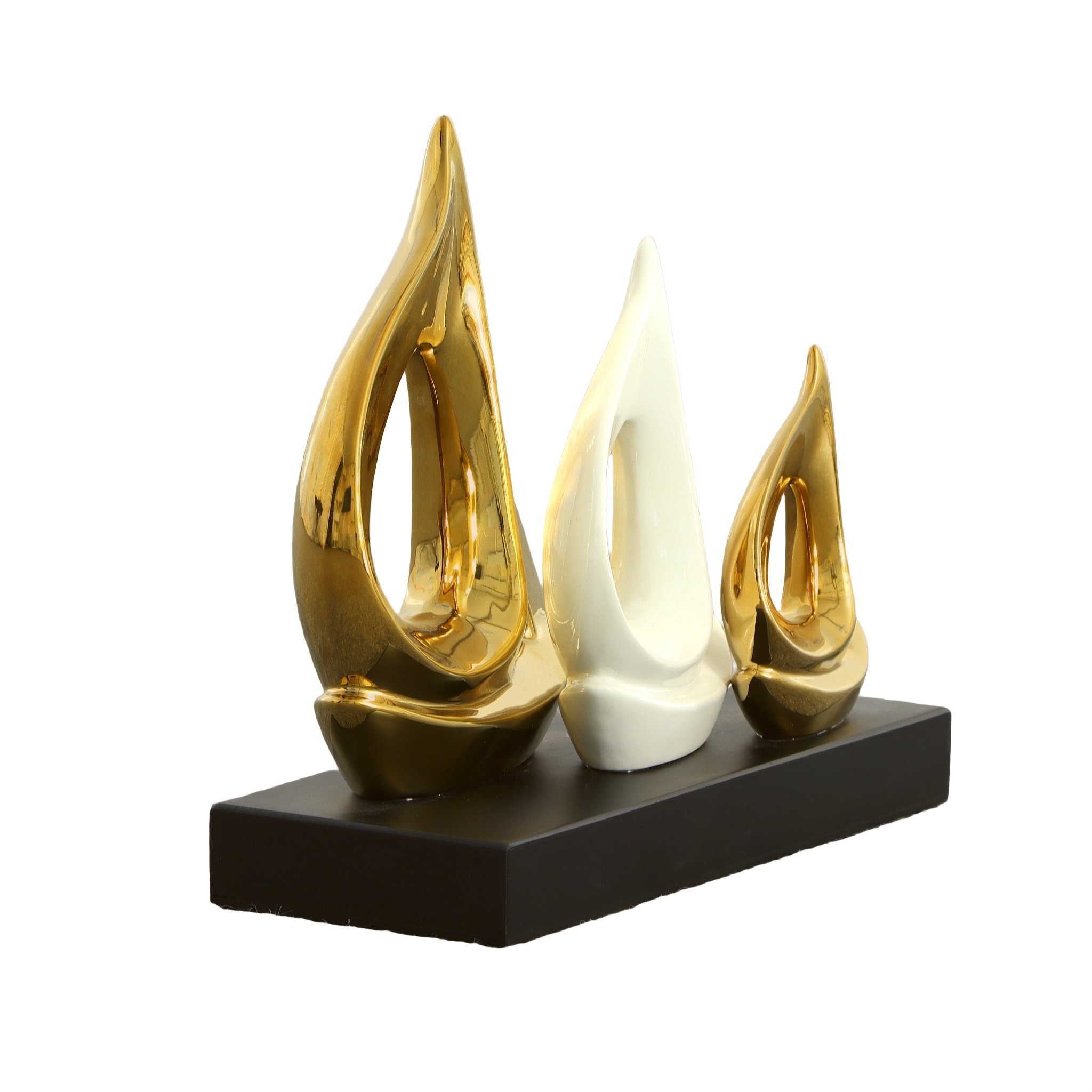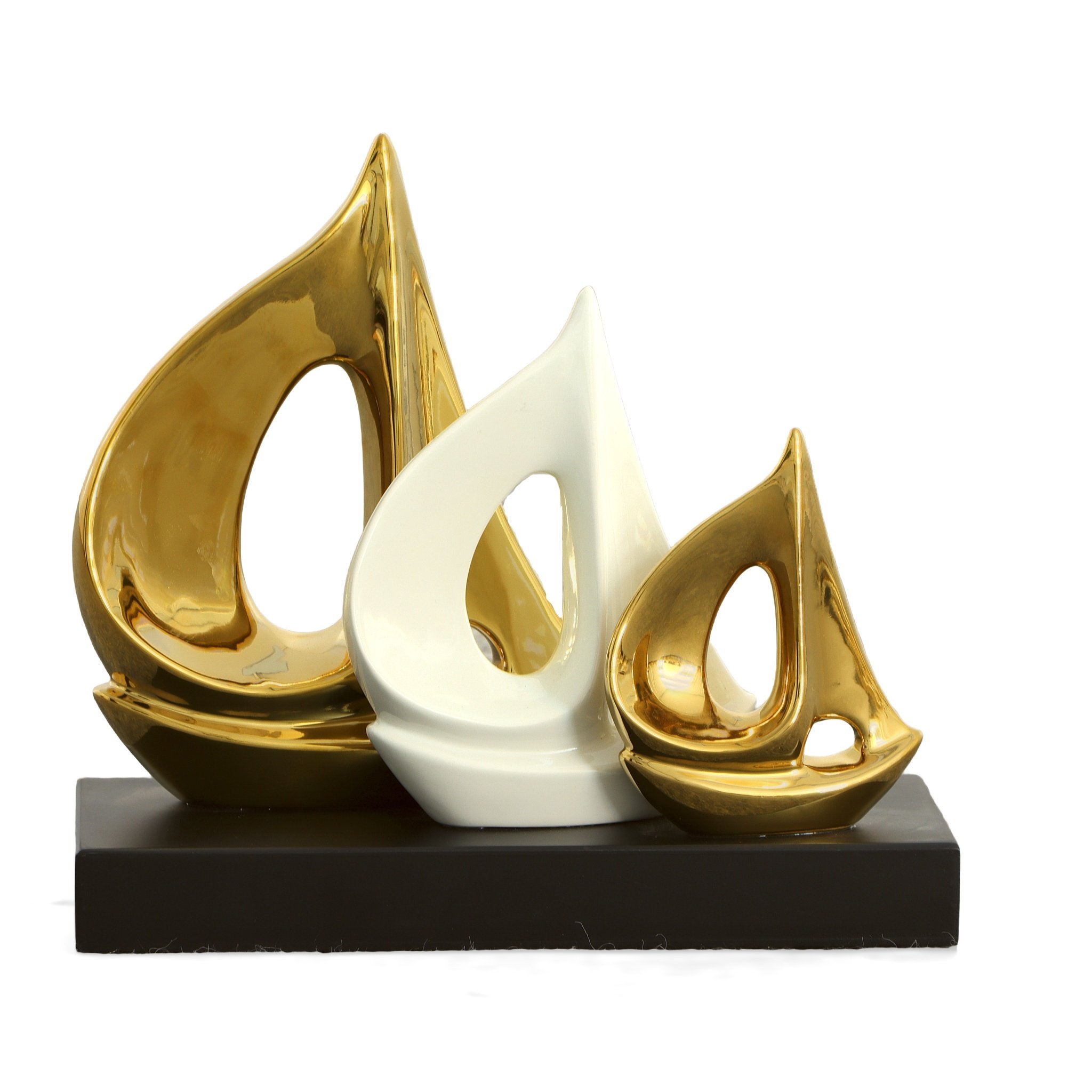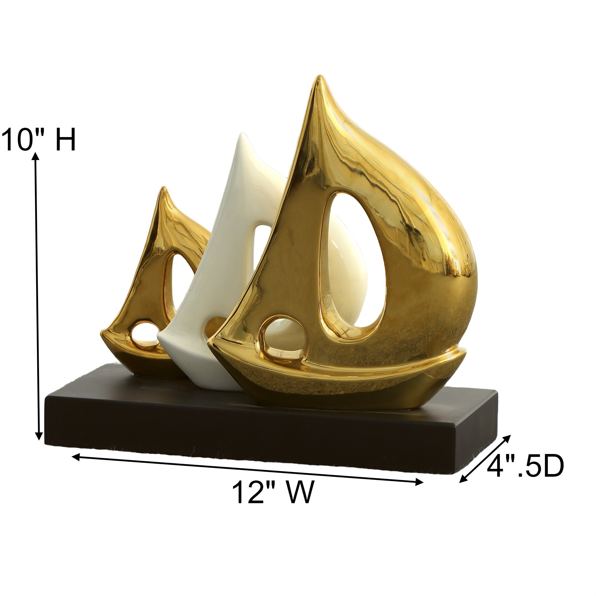 The White and Gold Boats on Base from AFD Home is a unique abstract home décor item depicting three sail boats in graduated size. A beautiful gold finish on either end with a soft cream finish in the middle while being mounted on a black base provides just the right amount of contrast while simultaneously tying in several colors from around your room.