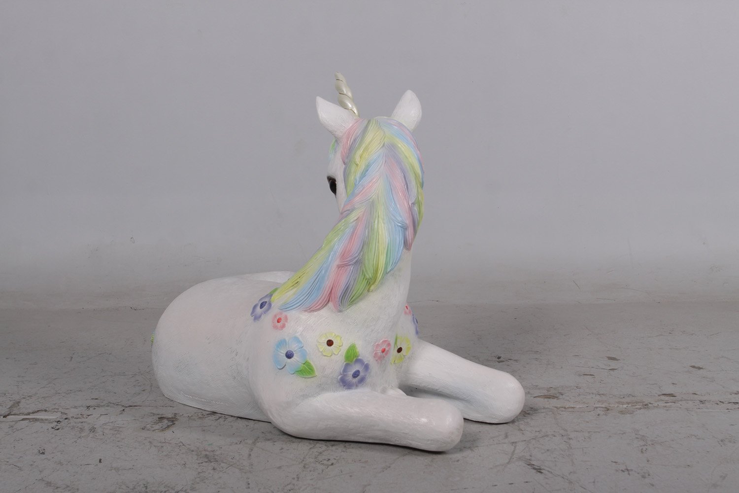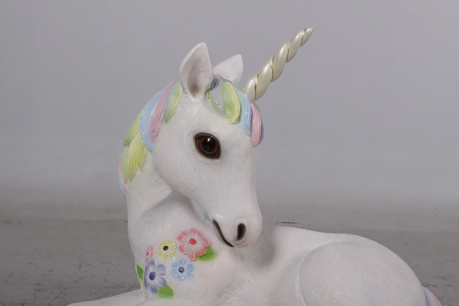 Our Unicorn Foal Resting Rainbow is 26" long. It is a fanciful creation that will bring smiles and pleasant dreams to young and old. The unicorn also the symbol of Scotland is a legendary horse-like creature described since antiquity with its pointed, spiraling horn and said to possess magical powers and heal sickness. The item is hand cast in durable Fiberglas and Hand painted beautifully in white with a rainbow of colors softening its mane.