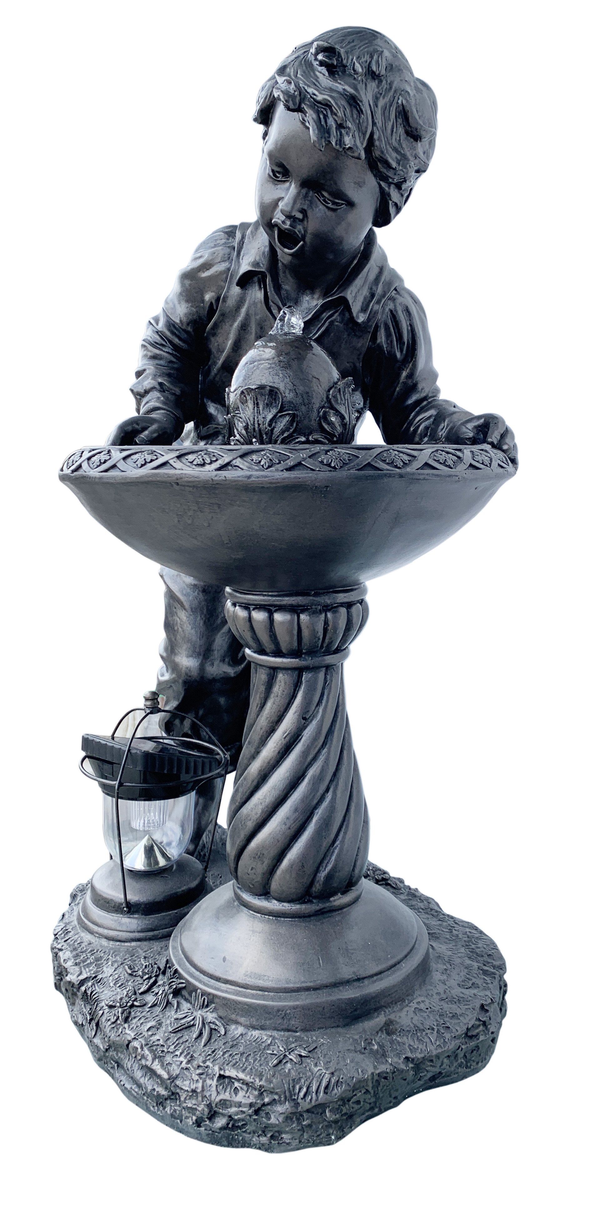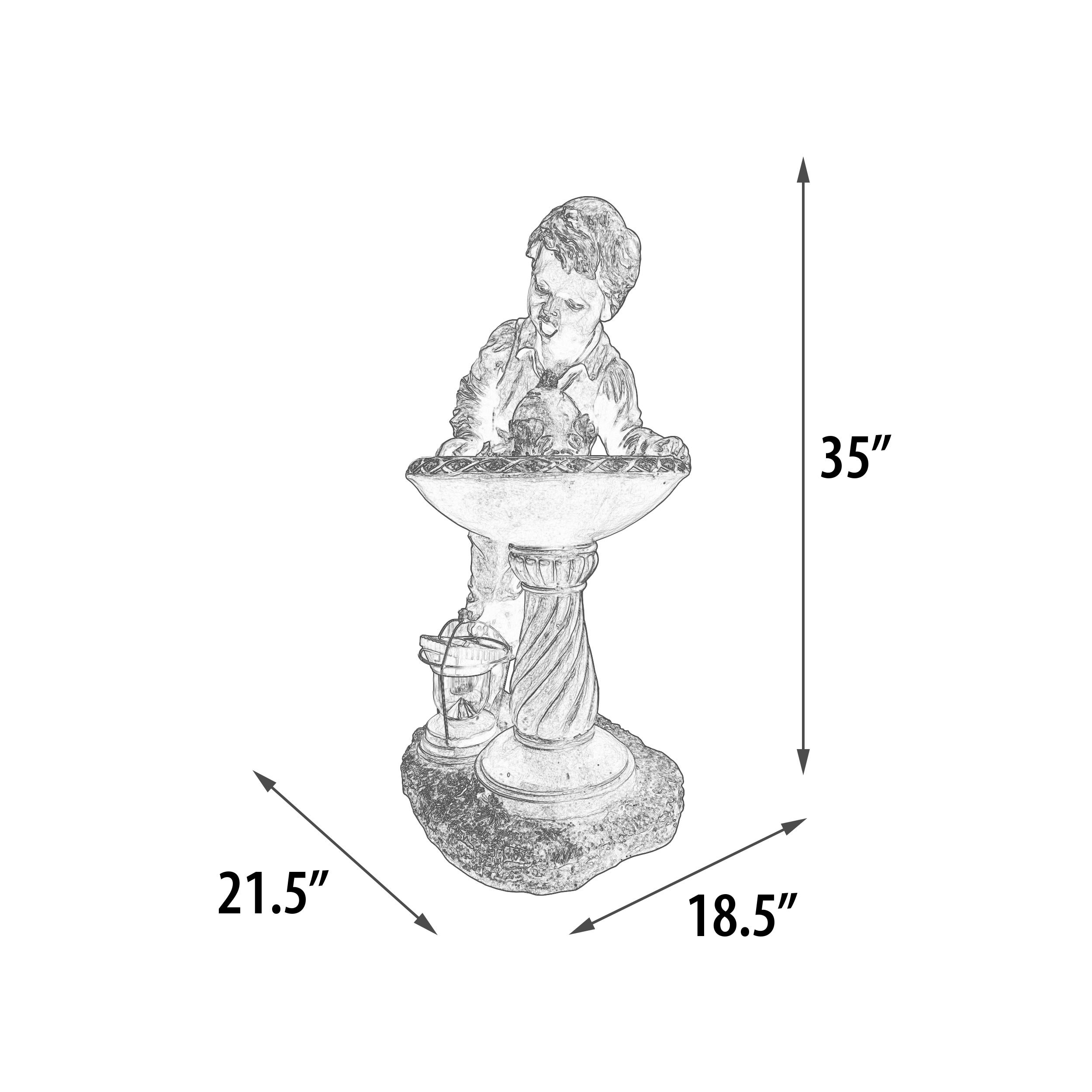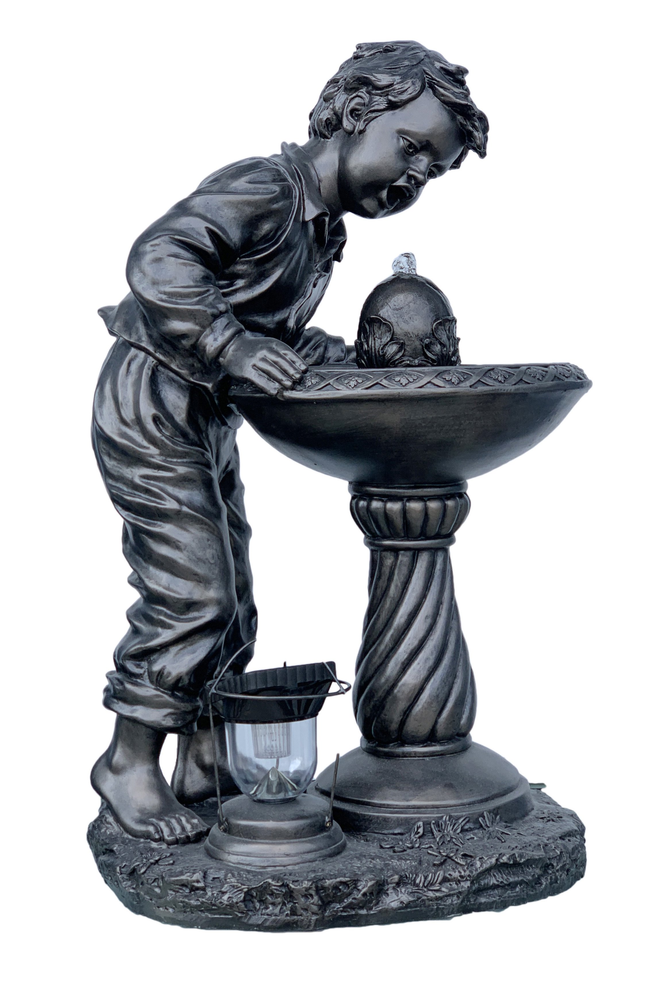 From our self contained working fountain Collection comes this new Creation with a solar powered night light Lantern. Depicting a young Boy Drinking at Water Fountain Self Contained. A functional feature for your Decor that bring smiles to all. This unique self contained Fountain stands 35 Inches Tall. The item comes with an all weather bronze style of finishing. It is hand cast in durable all weather Fiberglass for long lasting use. Fountain pump is provided and operate with standard 110 v power. Lantern is solar powered and does not require external power. Minor assembly is required.