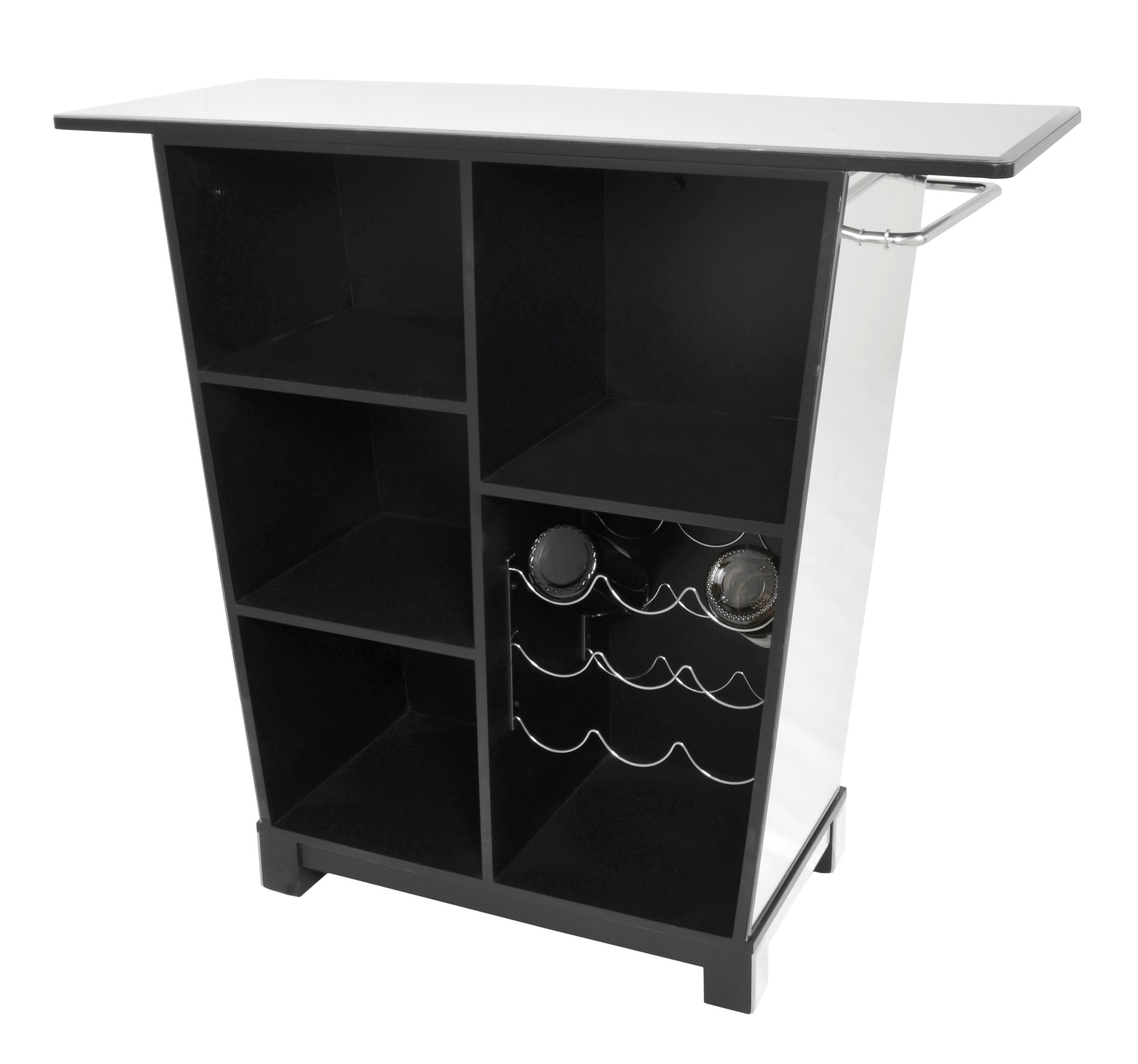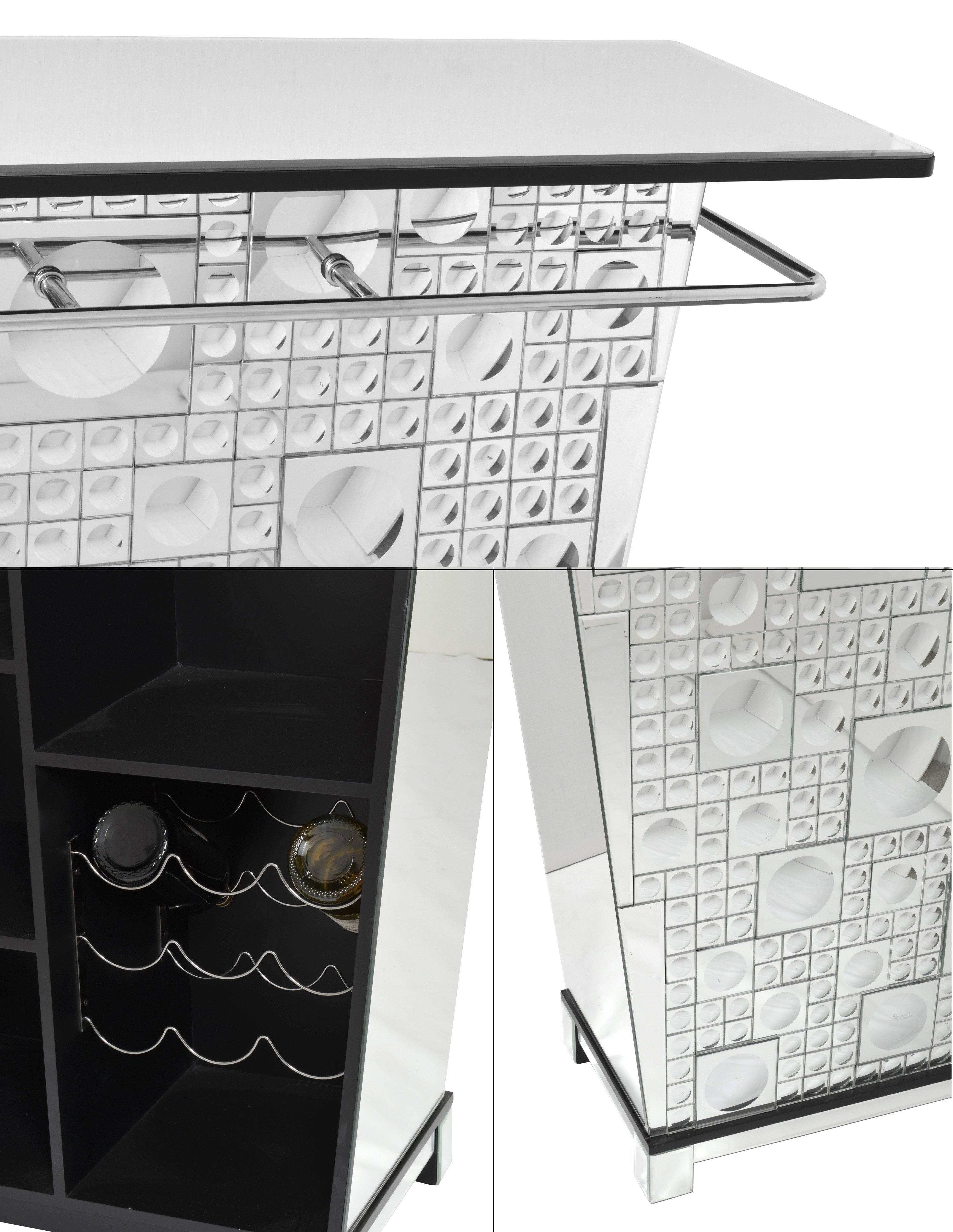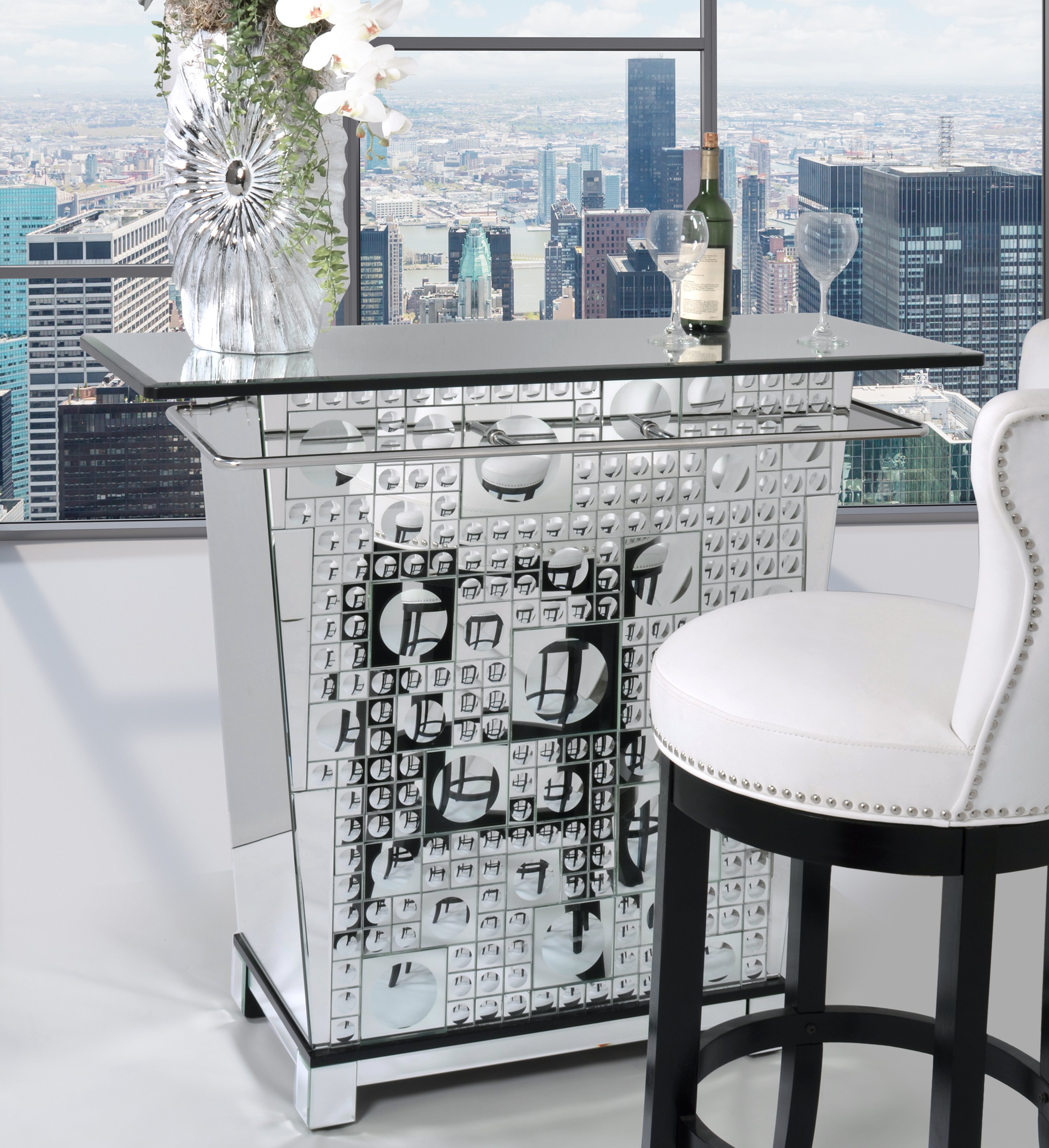 Convex Bubble Mirror Bar is a moderen glam element great for entertaining. Using intricate mirrors creates the illusion of both height and the different shapes give this piece an interesting design. Functional as a standalone bar.