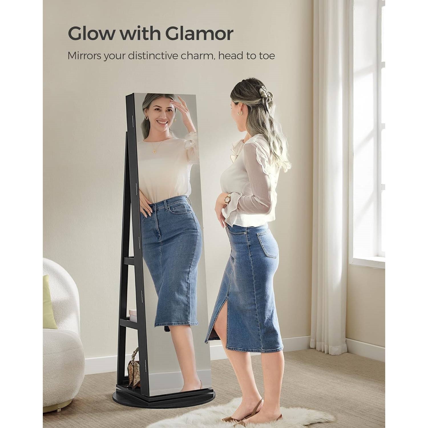 This Black Wood Jewelry Cabinet Armoire Organizer Freestanding Rotating Mirror comes with a 14.6" x 61" frameless, full-length mirror that’s easy on the eyes and gives you a head-to-toe reflection, making your daily outfit checks more enjoyable. 120 earring slots, 54 stud earring holes, 18 necklace hooks,104 ring slots, 3 bracelet rods—the jewelry jungle ends here. Plus, there are 3 compartments, 2 drawers, 4 shelves, and a bag for your makeup! 6 LED lights illuminate your jewelry when you open the door of this jewelry organizer, allowing you to pick out the right accessories easily without waking your beloved one with ceiling lights. A built-in mirror and a flip-over shelf as a counter for your makeup create a mini “vanity table”, allowing you to apply makeup and accessorize your look without closing the cabinet door. The large 21.5" Dia. round base and quality MDF of this jewelry armoire ensure stability while its velvet lining protects your jewelry from scratches—your bling will remain intact for years to come. This jewelry mirror cabinet rotates 360 degrees to allow you to access what you need easily from the 3 shelves on the back, and hide them out of sight when not in use. Who doesn't want flexibility like that? This jewelry armoire with a mirror comes nearly completely pre-assembled—all that's left is to attach the base and then add the shelves on the back of the cabinet. Following the clear instructions step by step, you'll have this mirror cabinet ready in a jiffy. If you want to keep your valuables safe and out of reach, this mirror jewelry cabinet ticks your boxes. 2 keys allow you to lock your cherished bling away, so no little hands get in.
