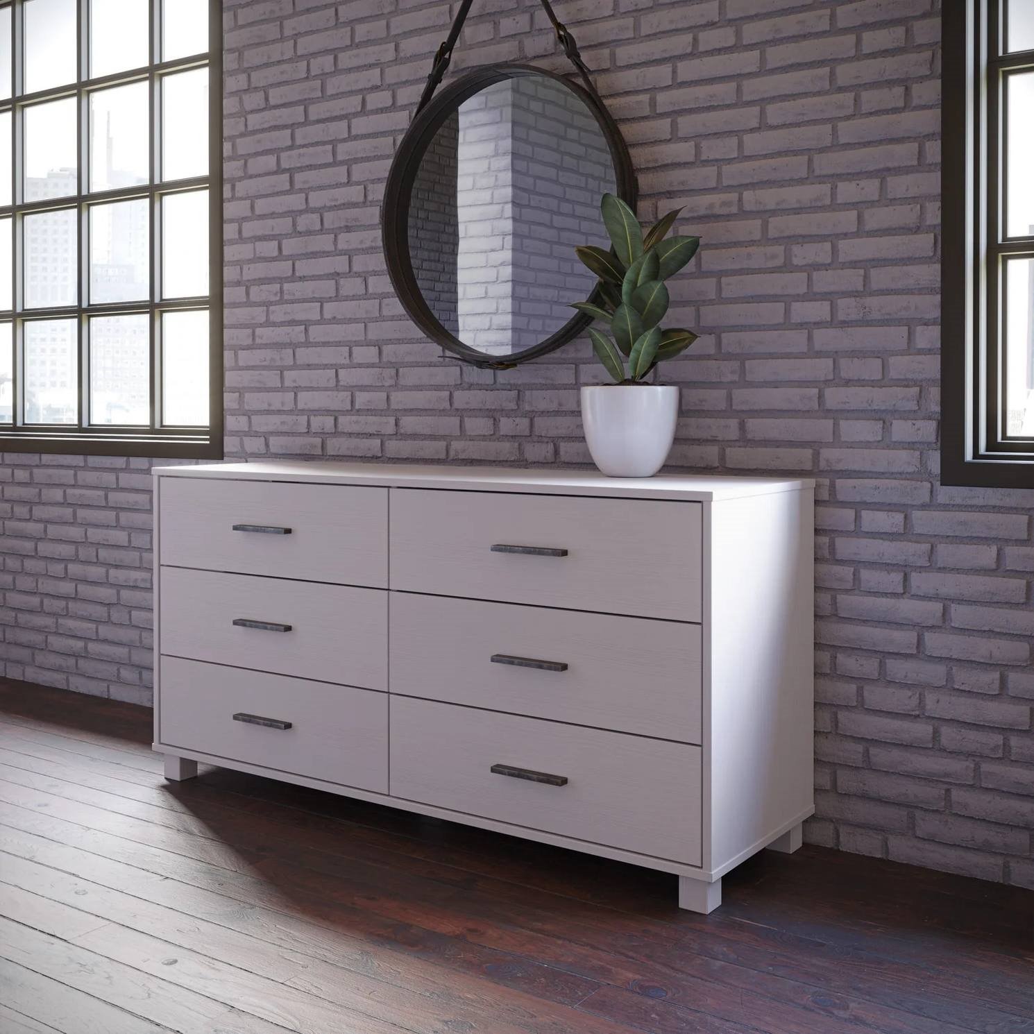 Give your room a modern look while adding functional storage space with the sleek Farmhouse Modern 6 Drawer Double Dresser in White. A high-quality, wire-brushed finish combines with solid wood to create a piece with quality and craftsmanship usually not seen on such modern pieces.