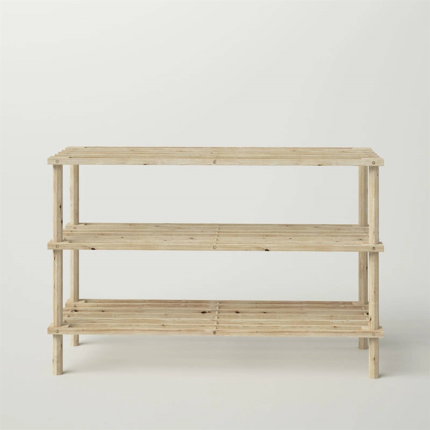 This Solid Pine Wood 3-Tier Shoe Rack - Holds up to 12 Pair of Shoes keeps all your shoes neat and organized while also keeping your entryway free of clutter. It's made from solid pine wood in a natural wood grain finish that blends in perfectly with any color palette. It comes with three open slat shelves that allow for proper airflow, giving it a light and breezy look and feel. Plus, we love that this shoe rack allows you to store up to twelve pairs of your favorite sneakers, boots, and flats. Assembly is required.