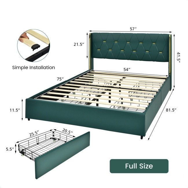 This Full Size Green/Gold Linen Headboard 4 Drawer Storage Platform Bed is designed with 4 large drawers to accommodate your pillows, bed sheets, seasonal clothes and more. Crafted of high-density sponge and breathable linen fabric. The steel construction is sturdy enough to withstand a 660 lbs weight. With a tufted headboard, the bed frame looks very lavish and elegant, which definitely brings a sense of fashion to your bedroom. More, its installation is very simple. Each slat can be firmly installed by a hand pressing.