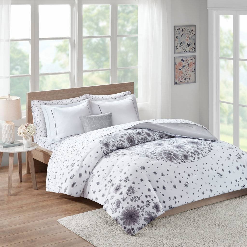 • Full size 8-piece White Grey Floral Pattern Microfiber Comforter Set