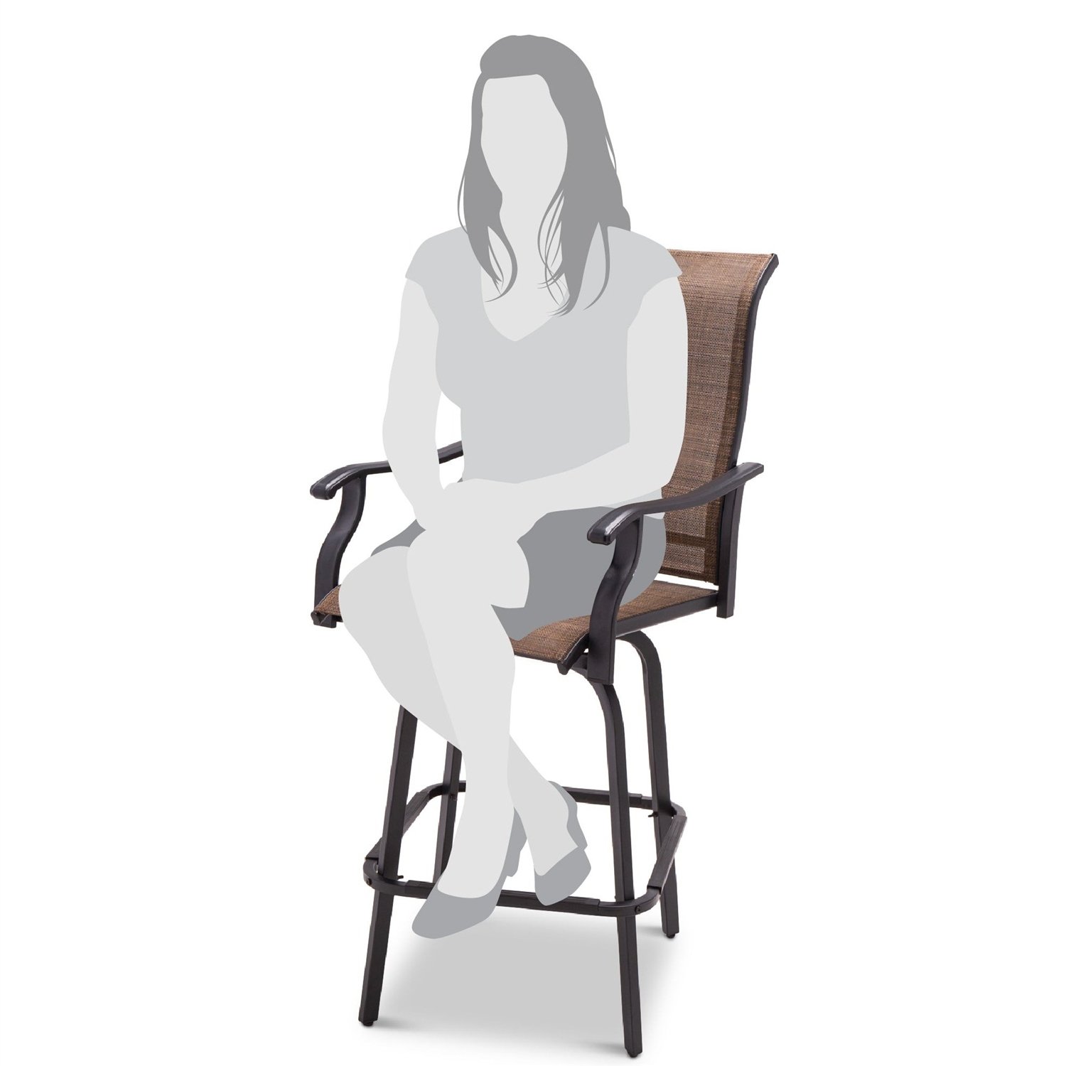 Smooth bearings in a classic rotating platform design let you freely turn and partake in the conversations all around you with this Set of 2 Brown All-Weather Mesh Swivel Barstools. High-quality powder-coated steel overlaid with textilene mesh creates an attractive, UV- and weather-resistant surface built to last. The steel frame includes a built-in support bar/ footrest for your comfort while breathable fabric. These chairs are built to be level with most bars and come with a wide seat and armrests for hours of seated relaxation