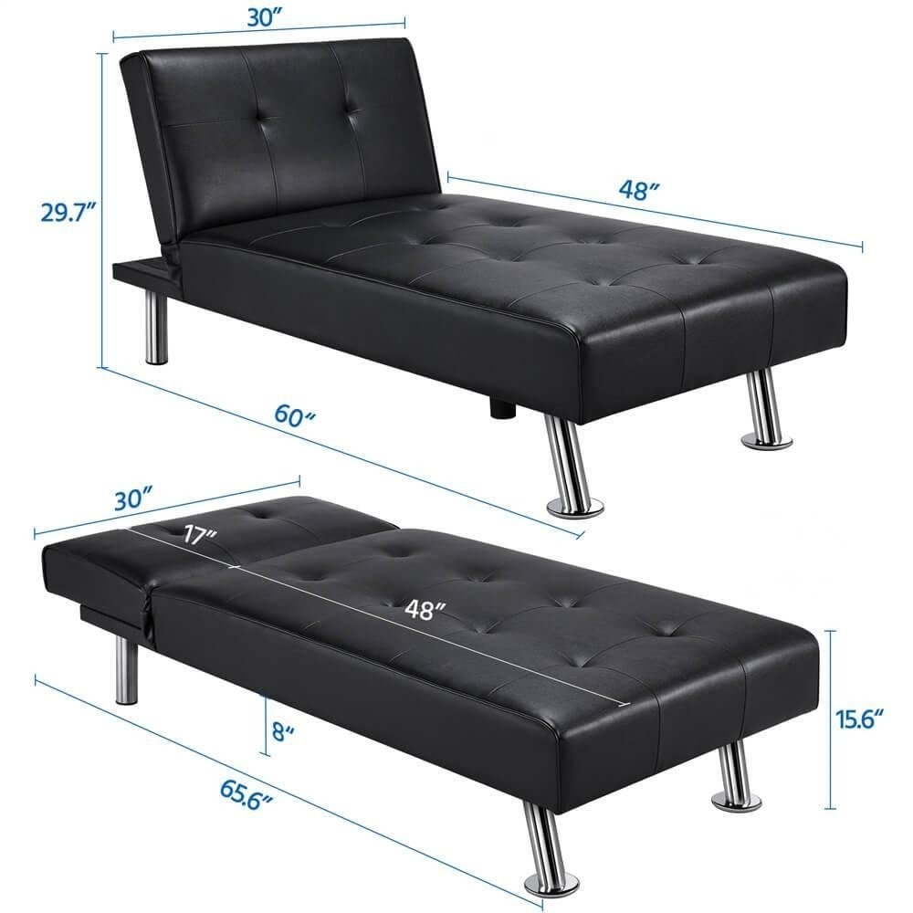 Sit back and relax in style and comfort with this Black Modern Faux Leather Chaise Lounge Sleeper Sofa. Classic faux leather upholstery features the design for a luxurious modern appeal, while tufted details give a touch of texture to the chaise lounger. Pairs well other convertible sofas. This chaise lounger has a folding contraption and the lounge back can be locked at 105 degrees for reading/TV or 140 degrees for lounging, and/or put down flat as a 65.6 inches L x 30 inches W platform bed for sleeping. This sturdy convertible chaise lounger sofa is crafted with a plywood frame, faux leather covering, foam fill, and strong metal spring for robust structure. The water-resistant faux leather upholstery and chromed plated legs can be cleaned with a damp cloth and mild cleanser. Hold up to 600 lbs. Assembly is a breeze, just 3 simple steps.