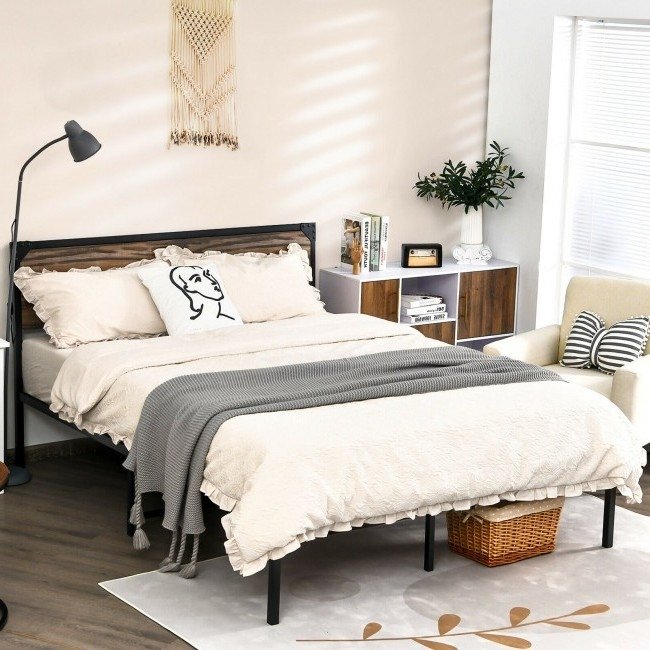 This Rustic FarmHome Metal Wood Platform Bed Frame in Full Size combines a simple rustic industrial Farm House style. Comes with a sturdy black metal bed frame and vintage wooden headboard. Constructed of powder-coated steel slats, the metal bed frame ensures rugged and durable structure. 5 reinforced support legs and solid screws enhance its overall stability and provide better support for the bed frame. Bed has 13.5 inches under-bed storage space to store boxes, suitcase and other items.
