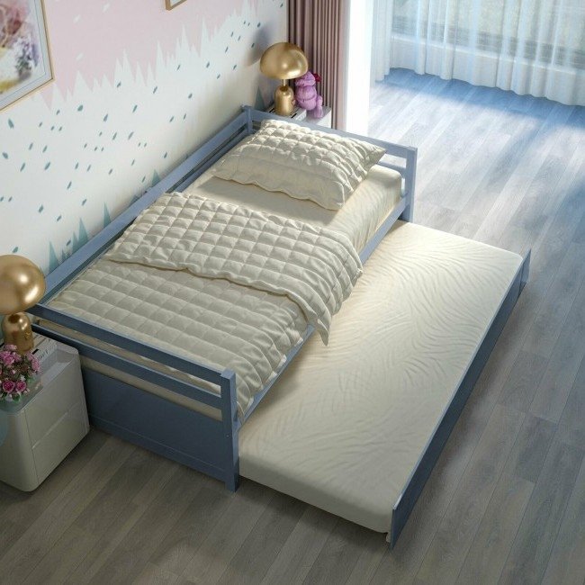 The Twin/Twin Dorm Style Trundle Daybed Platform Bed Frame in Grey is perfect for any kids rooms, college dorm, or guest room. Multifunction daybed can be used as a sofa or 2 twin beds. Made with solid sturdy legs and thick slats, the daybed has a high weight capacity to firmly support your mattress without a box spring. Mattresses not included.