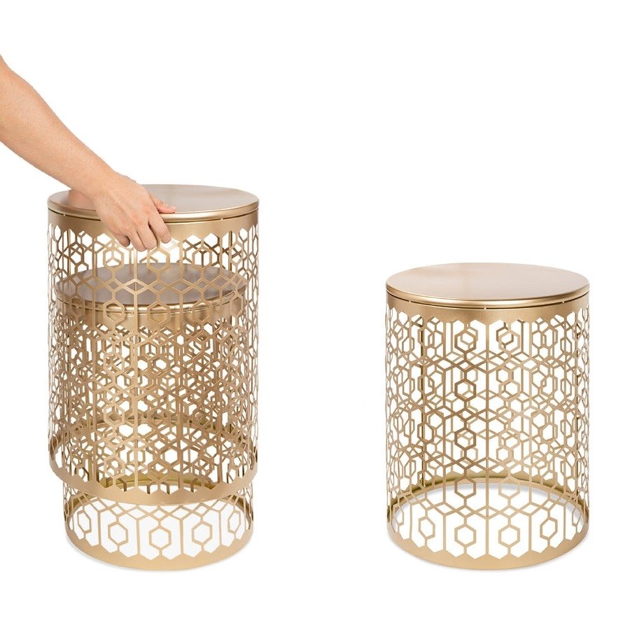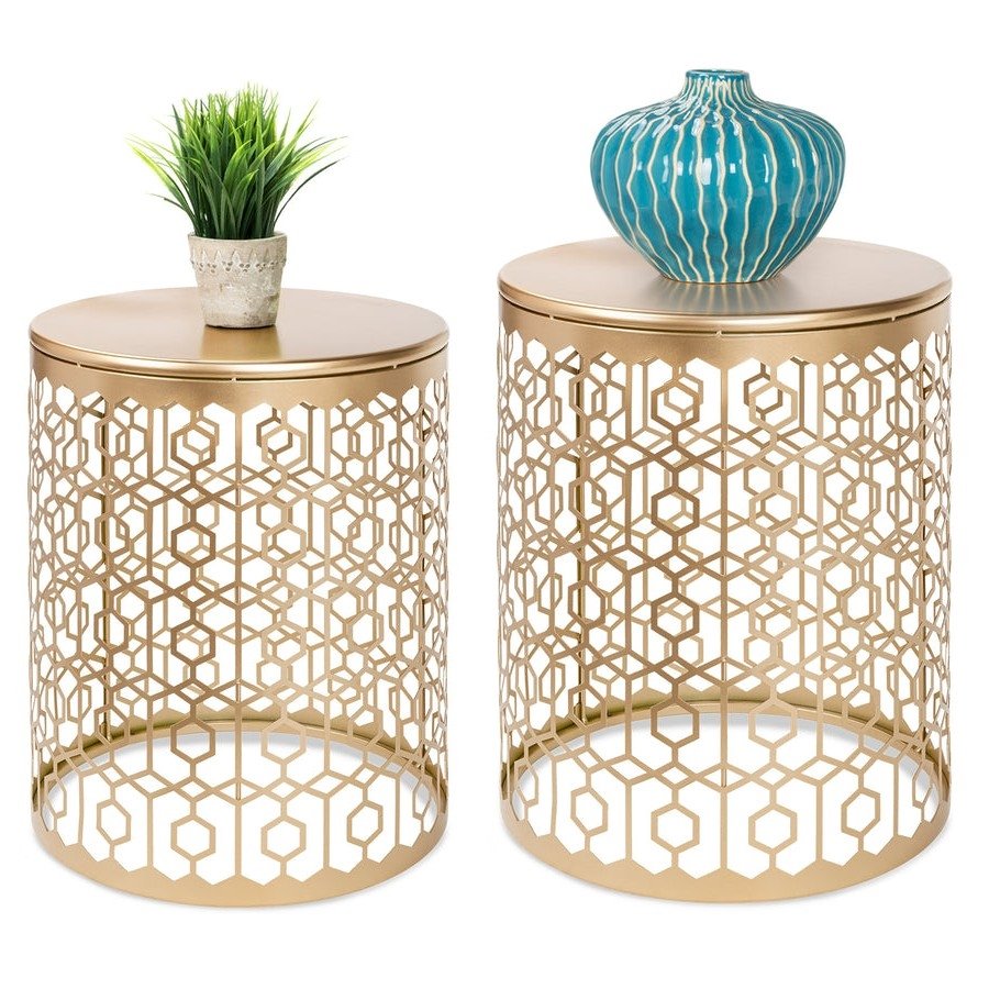 Simplify your home with this no assembly needed Set Of 2 Circle Charm Round Accent Table Nightstand Gold. A simple yet elegant appearance complements any space while minimizing your clutter. Countless diamond and hexagon shapes connect all around each table to creating stylish eye catching patterns that add unique style to any space.