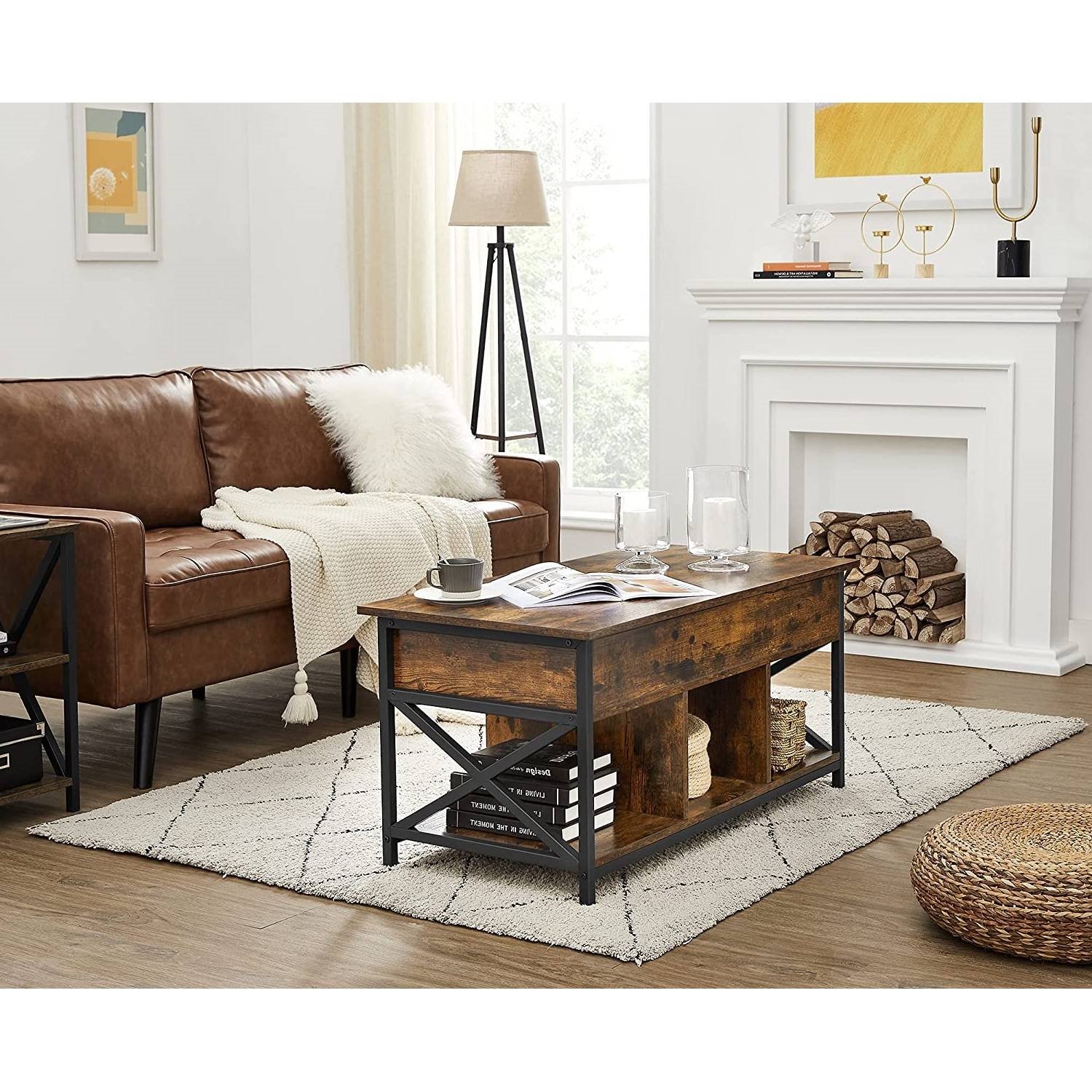 This Farmhouse Lift Top Muti Functional Coffee Table handy lift-top design of this functional coffee table lets you pull the top closer to you for working on your laptop, eating, or playing board games. Underneath the lift-top table is a magic place to stash bits and pieces for creating a tidy living room when guests come over. Down below, there are 3 open compartments for board games or larger items for convenient access. The quality lifting hardware with reinforced joints moves smoothly and silently while also supporting the table top steadily. Supported by steel legs and adjustable feet, this cocktail table with storage provides long-lasting strength. The rustic brown surface warms up your space, while the matte black steel together with X-shaped side frames exudes cool, industrial vibes.