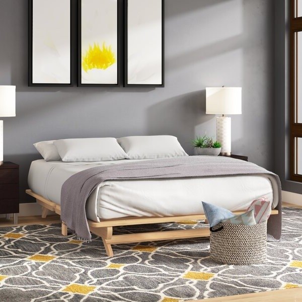 Ideal for any bedroom this Farmhouse Full Size Solid Wood Platform Bed Made in USA features a simple, versatile silhouette. Crafted from solid poplar wood, this frame comes smooth and unfinished and can be painted or stained for a more customized look. Its low-profile frame features built-in slats to cradle your mattress, so there’s no need to add the usual box spring. If it’s time to redecorate or move apartments, this design folds in half for easy transportation.