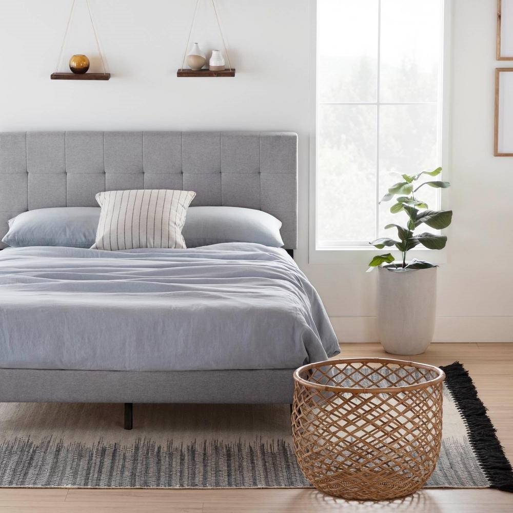 The Queen size Stone Gray Upholstered Tufted Platform Bed Frame features mid-century design, linen-like fabric, and sturdy support for a mattress. Durable and classy legs finish the design for a versatile look that will go well with most styles and preferences. The Queen size Stone Gray Upholstered Buttonless Tufted Platform Bed Frame eliminates the need for a box spring, and the easy assembly only requires a Phillips-Head screwdriver and the included Allen key. Fits any standard queen size mattress.