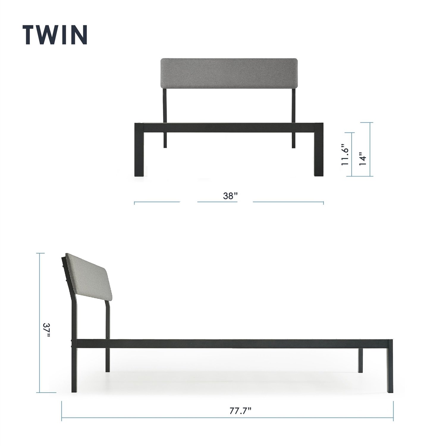 Twin Size Grey Soft Fabric Metal Headboard Platform Bed Wooden Slats is a simple and modern design made with a unique combination of metal and fabric. The traditional upholstered headboard is lowered in height and angled to create a backboard for the perfect leaning position. This backboard is filled with high density foam for comfort and support, available in soft grey. We've also left 11 inches of clearance under the bed for convenient storage. Enjoy quick and easy assembly with roll-out non-slip taped wooden slats and no other tools needed. Assembly is required. Fits any standard twin size mattress.