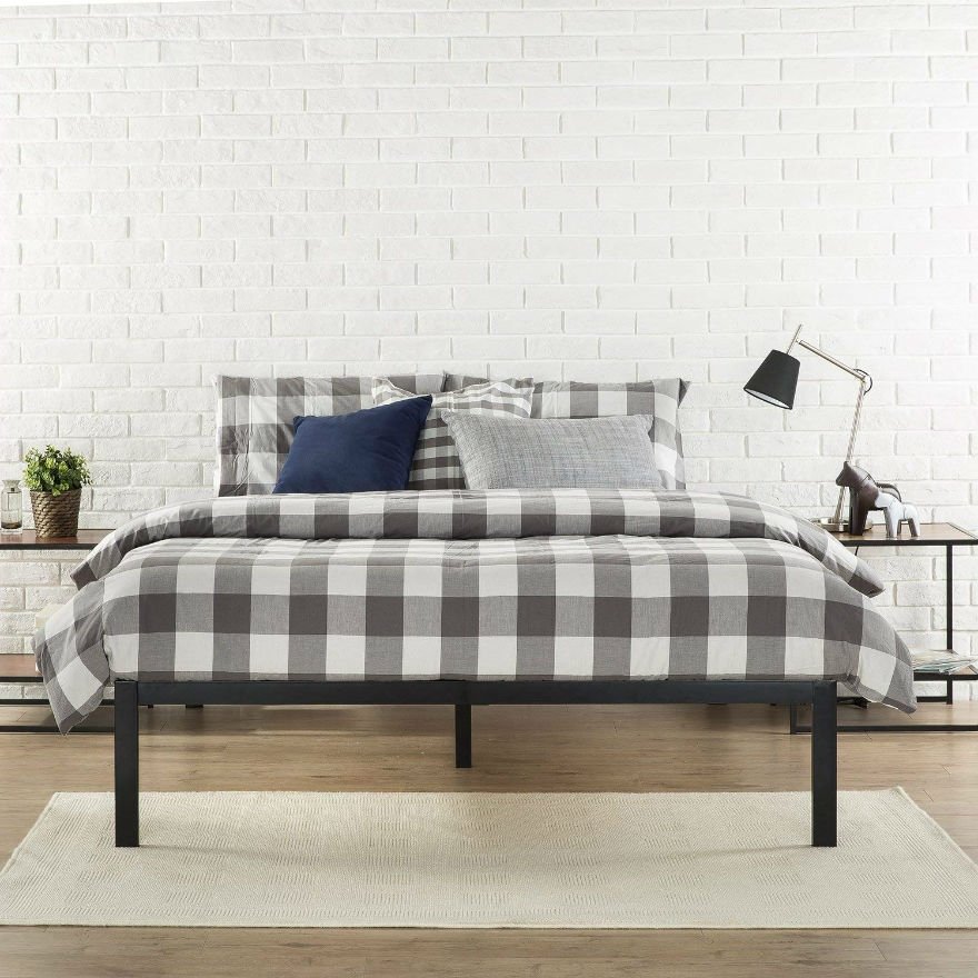 The steel framed modern black metal platform bed frame features wooden slats that provide strong support for your memory foam, latex, or spring mattress. 14 inches high with 12 inches of clearance under the bed frame for plenty of under bed storage space. Openings in two of the legs allow for attaching a headboard to this Platform bed. Headboard brackets not included. This contemporary classic metal wood platform bed provides stylish and strong support for your mattress.