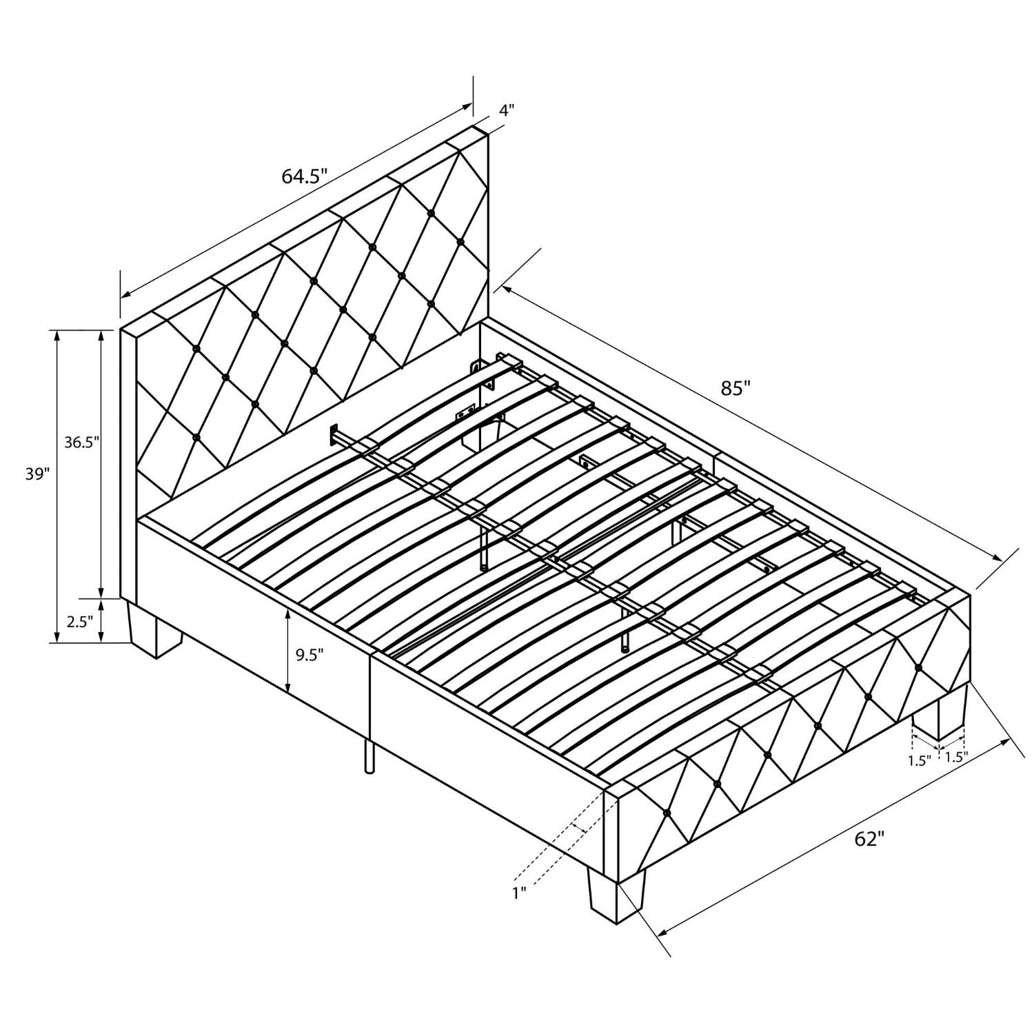 This Queen size Black Faux Leather Upholstered Platform Bed with Button Tufted Headboard boasts diamond button tufted detailing that radiates a contemporary chic look. Upholstered in faux leather with padding for extra comfort, this bed is designed to infuse some style and comfort into your room décor. Built with sturdy wooden slats for extra support, the Queen size Black Faux Leather Upholstered Platform Bed with Button Tufted Headboard does not require a box spring. Available in Twin, Full, or Queen size, this gorgeous bed can give you the style and coziness you are looking for.