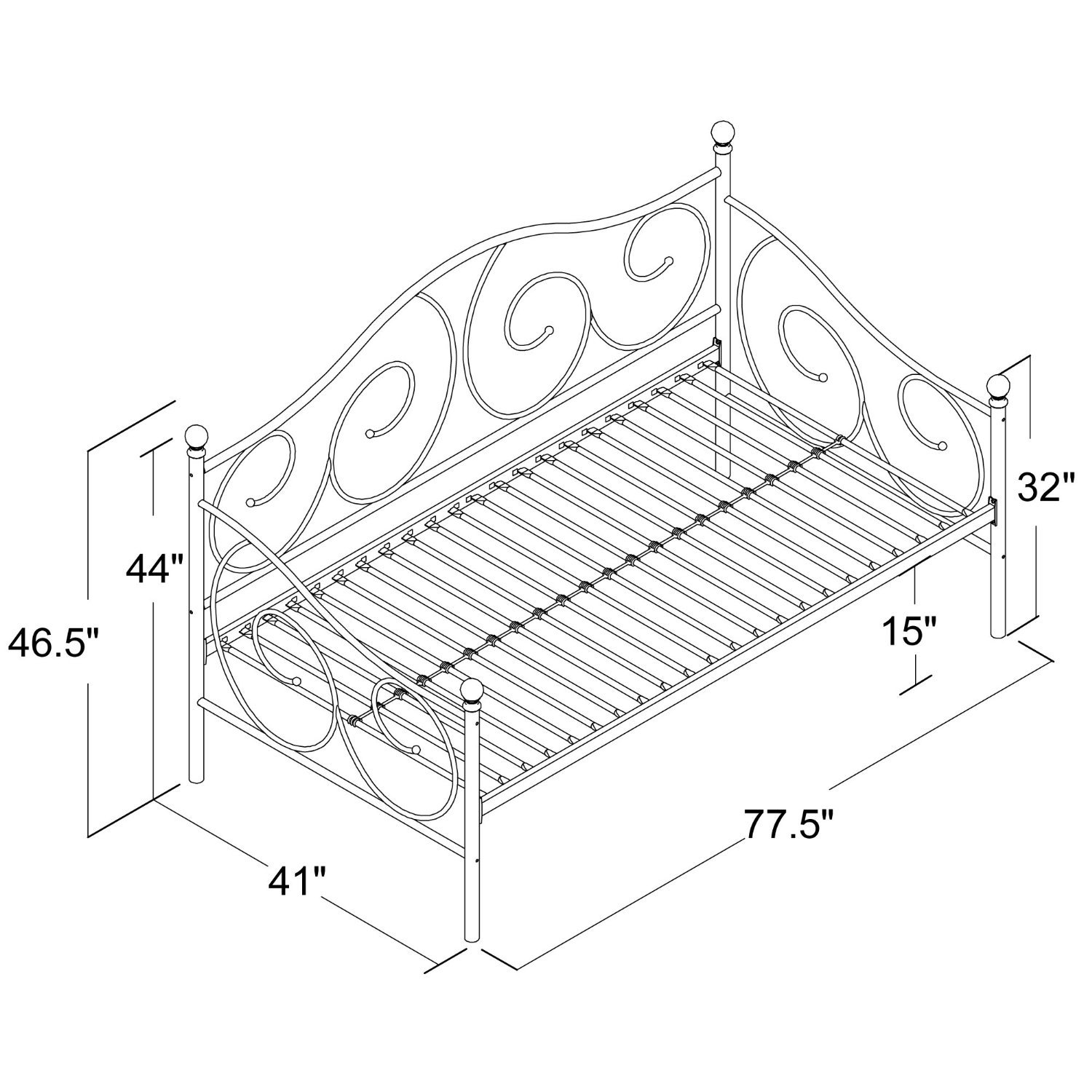 Whether you are looking for extra seating in the living room or a sleeper for overnight guests, this Twin size White Metal Day Bed Frame - 400 lb Weight Limit is the perfect fit. With round finial posts, a brushed metal frame and traditional scrollwork, this daybed has character that will add instant charm to any room. Sturdily constructed, the bed features metal slats and supporting legs for added support and comfort. No box spring required with this style of bed.