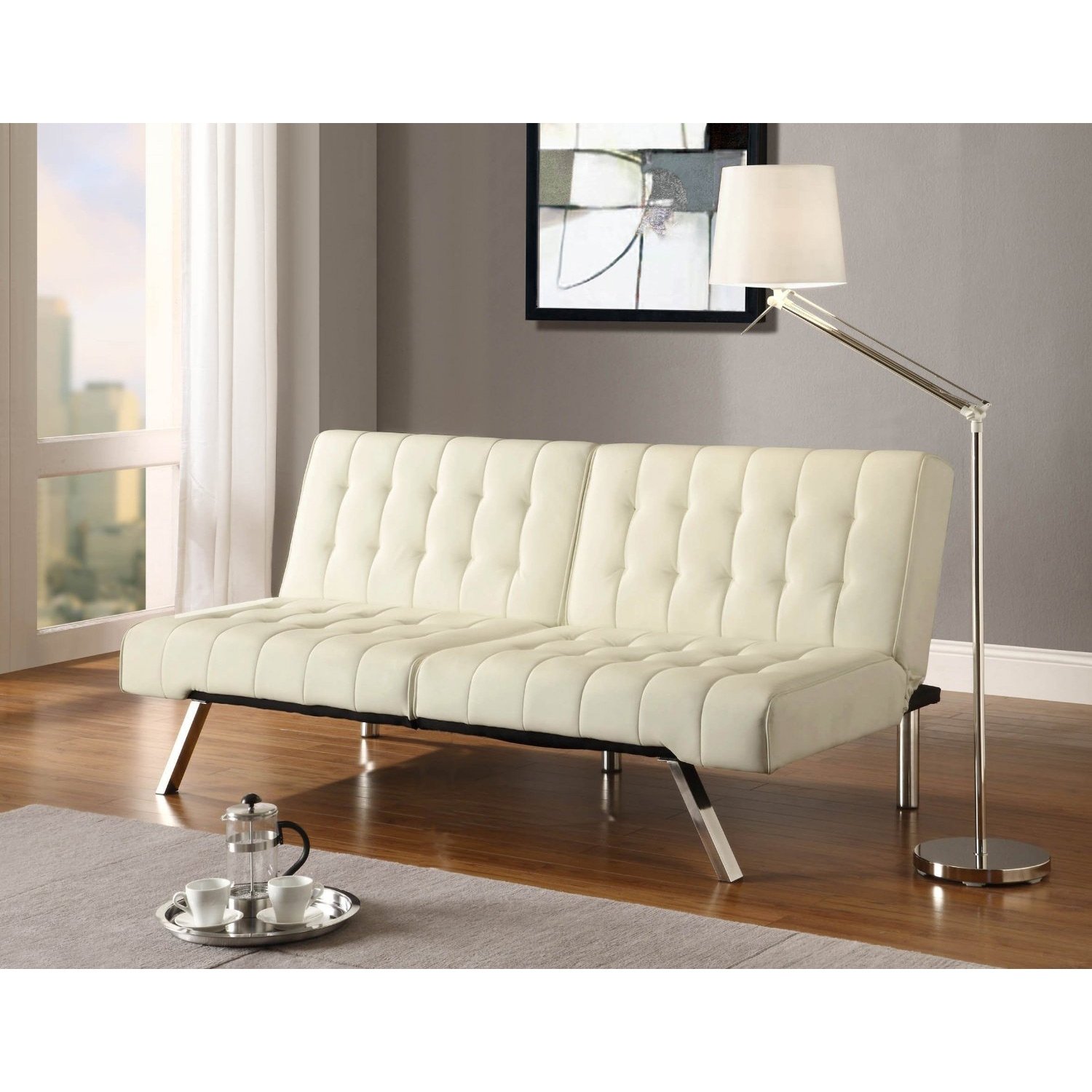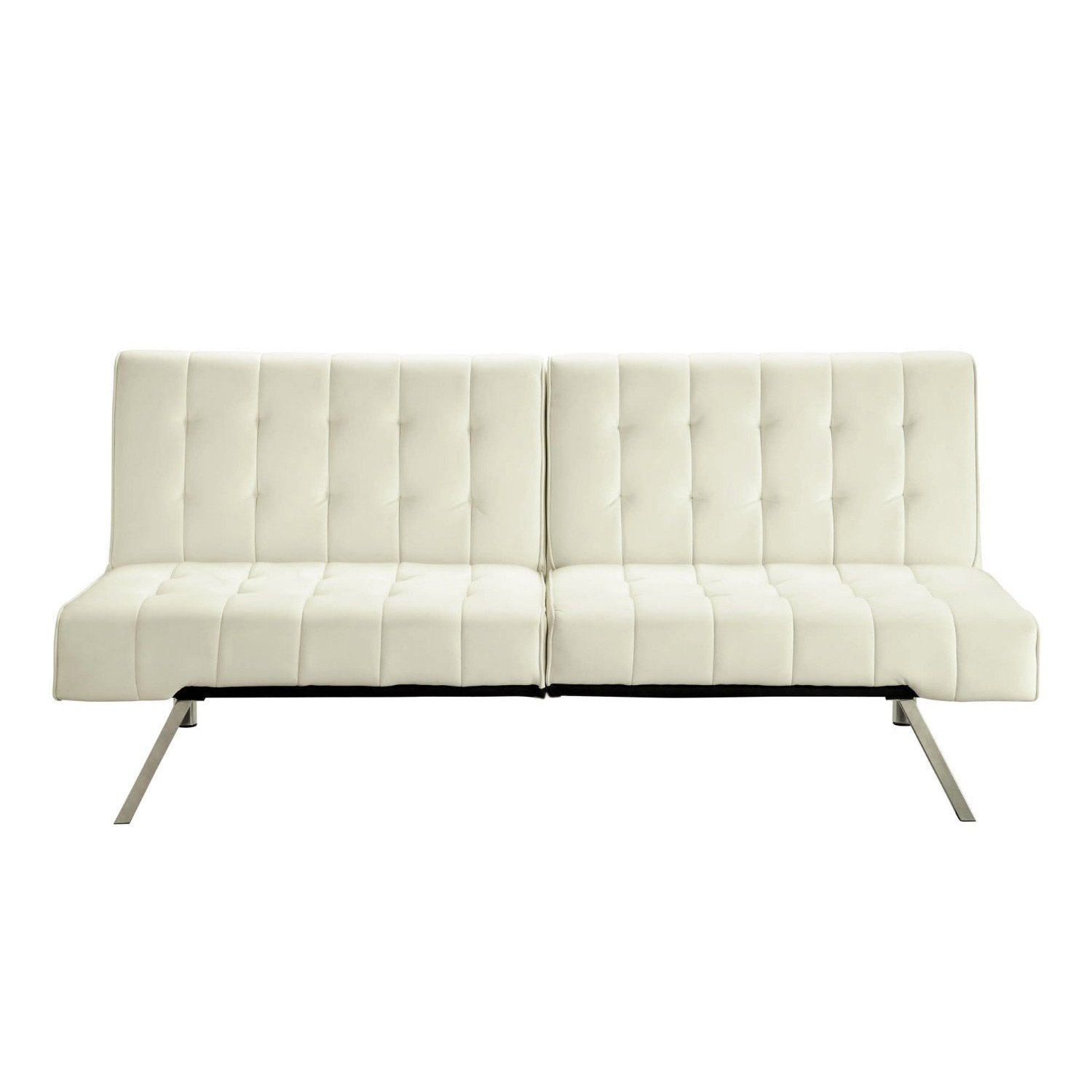 This Splitback Multi-Position Futon Sofa Sleeper in Vanilla features rich, water resistant faux-leather which wipes clean and sleek, stylish chrome legs . It easily changes from sofa, to lounger and sleeper with its multi position back and click clack technology. The cushioning is made of high-density polyester and foam for a firm mattress, making it both stylish and comfortable. Also available in white. Some assembly required.