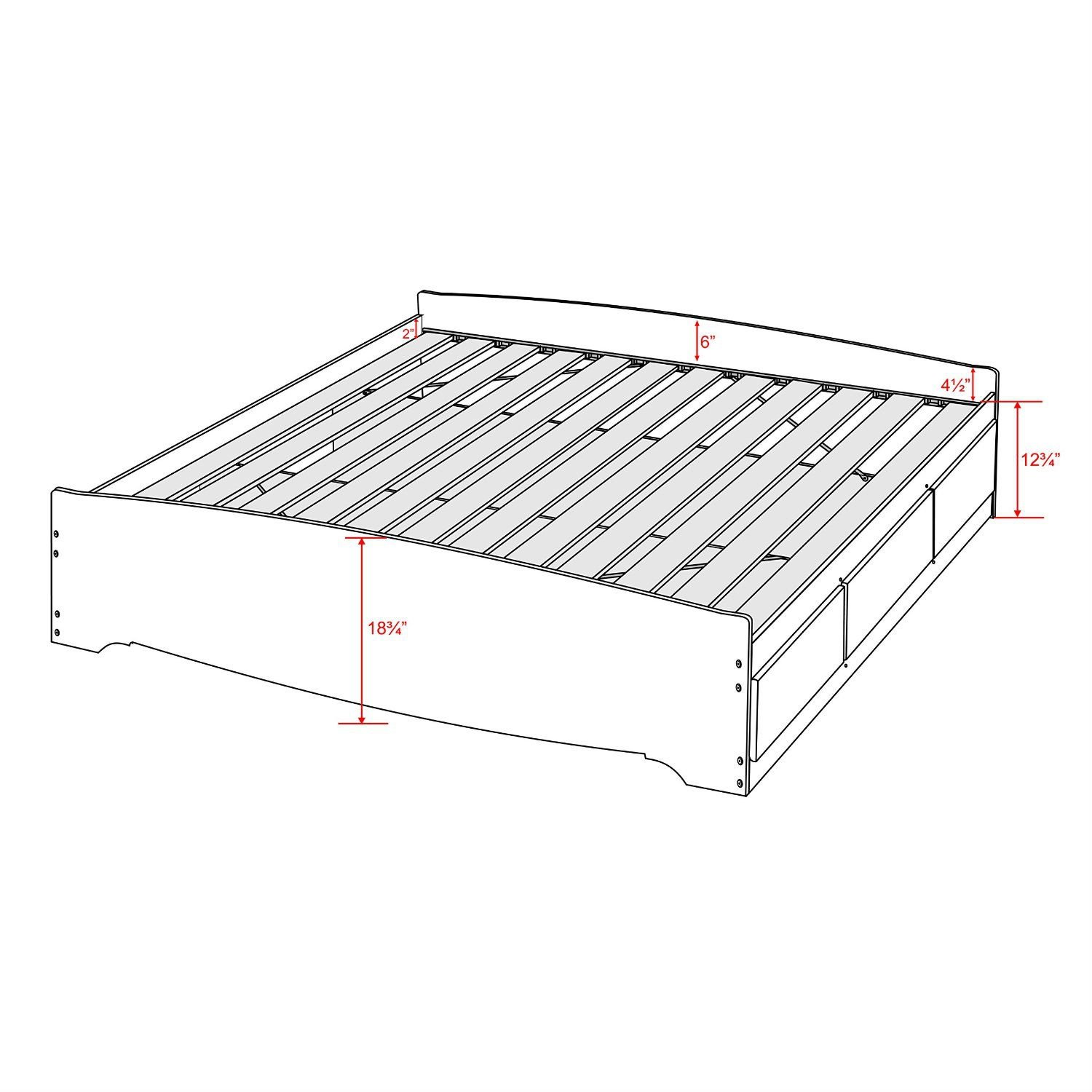 Our King Platform Storage Beds combine extra large drawers for plenty of storage space with a slat support system that requires only a mattress. Wood slats are positioned lengthwise to distribute body weight evenly, minimize the amount of motion transfer and take the place of a box-spring. Metal braces under the slats provide additional stability. Underneath are 6 large storage drawers (20” depth) that run on smooth running metal drawer glides. Drawers open easily with finger pulls located at the bottom of drawer fronts and knobs have been eliminated to prevent bedclothes from catching. They are large enough to hold anything you need to store: linens, blankets, clothes, socks and even shoes are just a few ideas. Coordinate with other espresso furniture items like our floating headboard with nightstands. Overall bed height is 21” if used with an 8” thick mattress. Available in two attractive finishes: Black and Espresso overlay laminates. This product is made from composite woods with plywood slats. It ships flat-packed (in three cartons) and self-assembly is required. Detailed and easy-to-follow instructions are included.